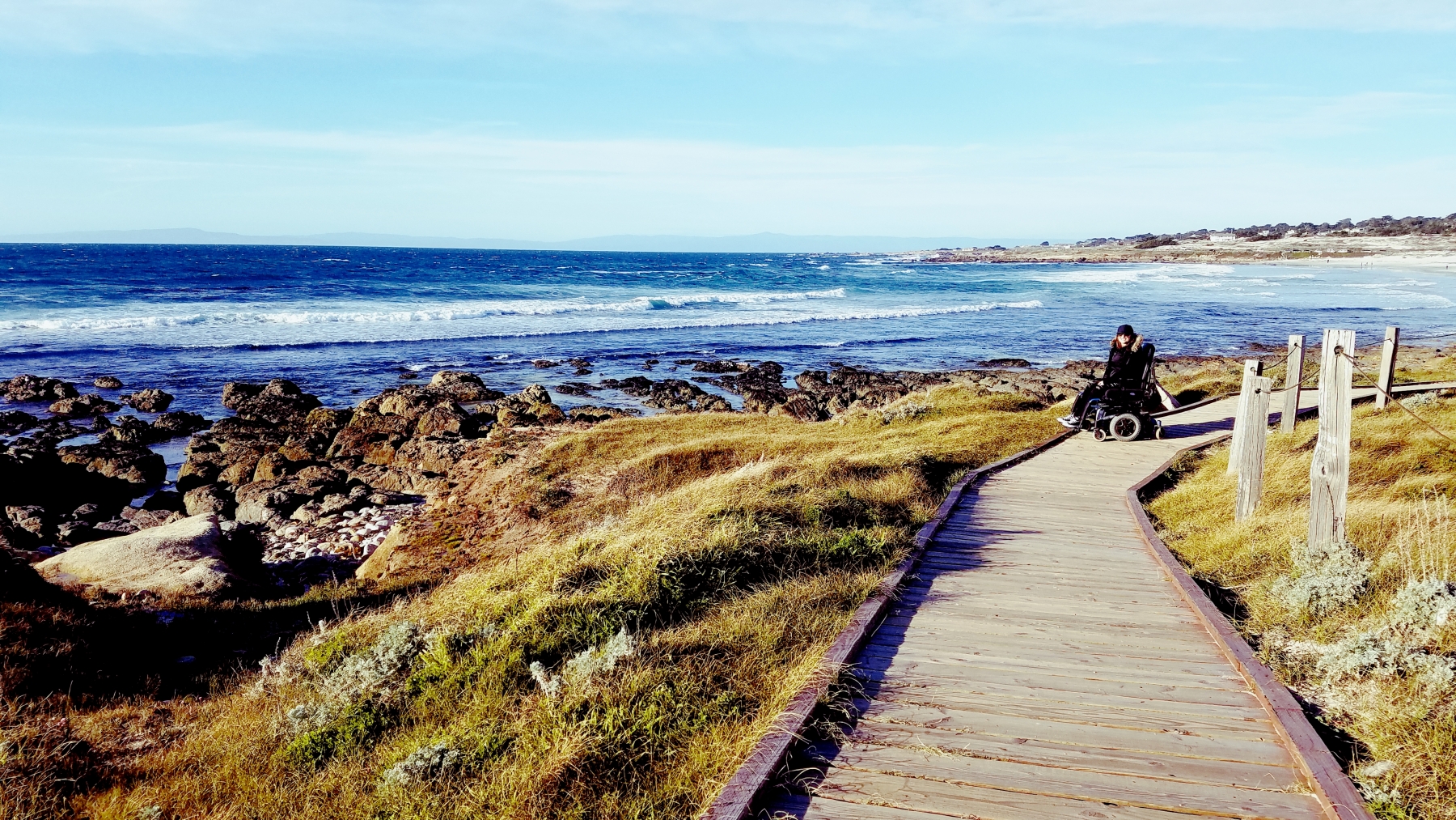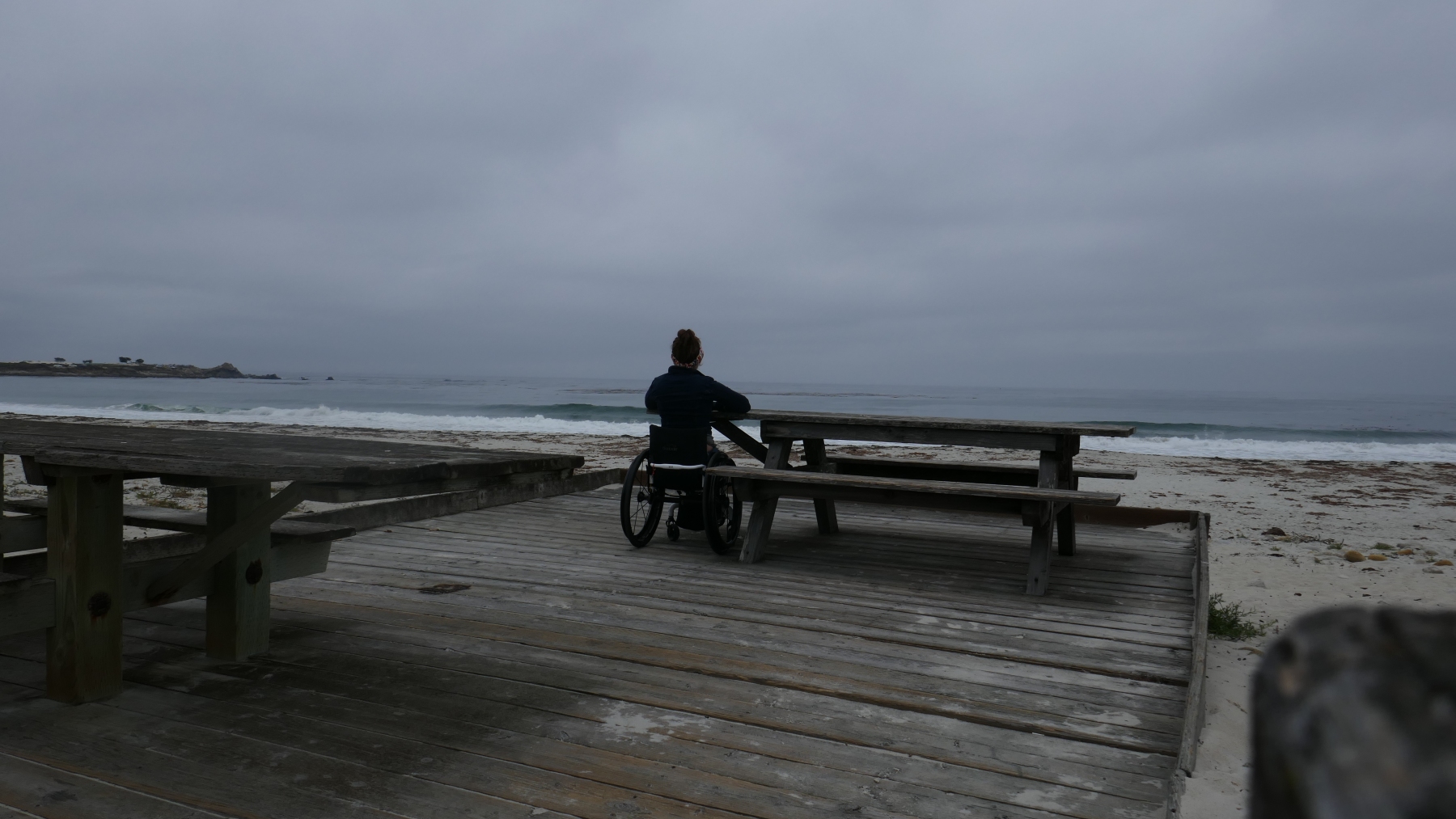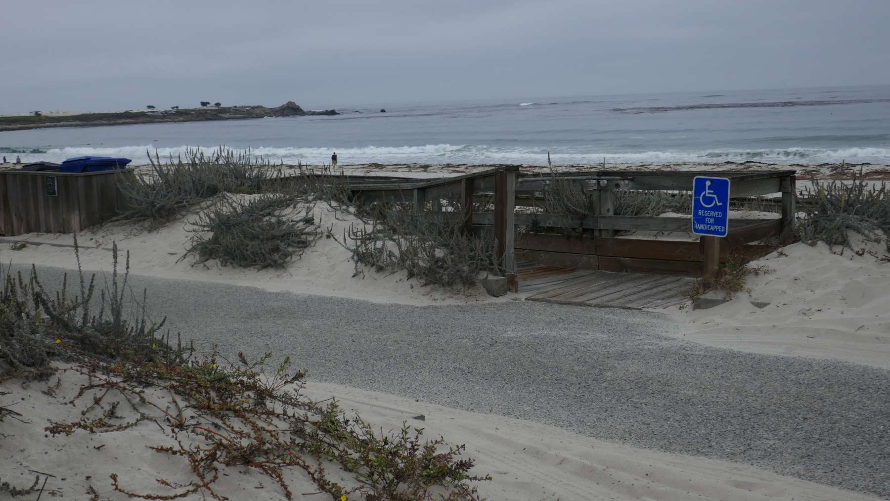 4. Coastal Trail beyond Bird Rock: Heading north from Bird Rock, along the ocean’s edge, with close-up views of surf on rocks and sand, the trail is accessible for .2 miles. Some wheelchair riders may be able to navigate an additional .2 miles with assistance, but eventually deep sand prevents further travel. To continue north, motorized wheelchair users can switch to a bike trail that runs between 17-Mile Drive and the ocean (from the southern Carmel entrance north to Pacific Grove).