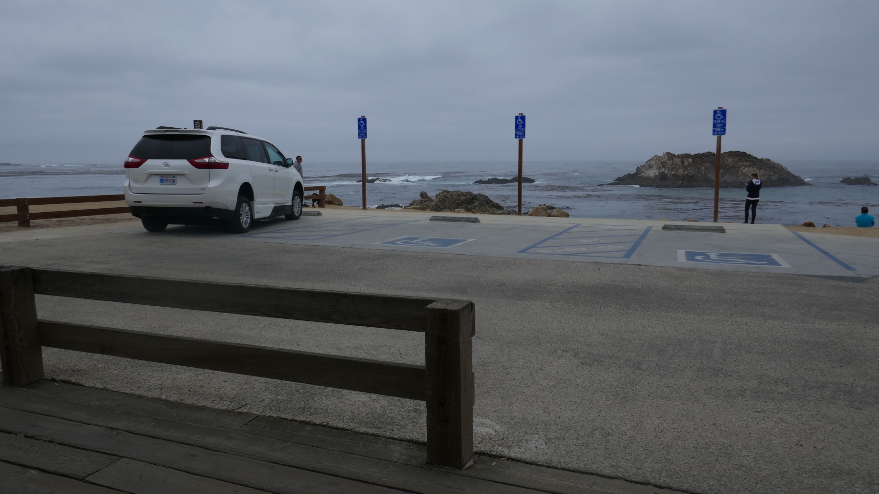 5. Cypress Point Lookout: South of Bird Rock and Seal Rock, but before the Lone Cypress is the Cypress Point Lookout. A couple of designated parking spots have been made with a cutout to the fenced, viewing area. A set of telescopes (binoculars) are setup, but are not accessible by wheelchair. The viewing area is mostly firm but does have some soft spots. Some may be able to get to multiple viewing areas. On my visit, I was fortunate to catch a group of otters off the shore feasting in the seaweed.