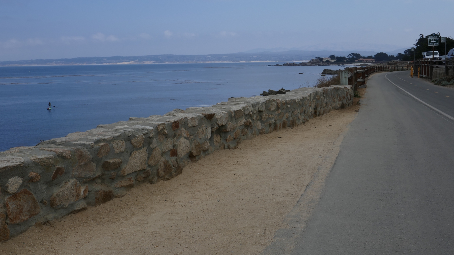 The grade is steep on the first mile from the gate to Spanish Bay and not recommended for manual wheelchair users. During our mid-week visit, traffic was light and slow, and the road along the low bluffs is wide and straight, so it was quite pleasant. Traffic is likely to be much heavier on weekends. Handcrafted benches made of lumber and set between embedded chunks of rock are provided at frequent intervals.