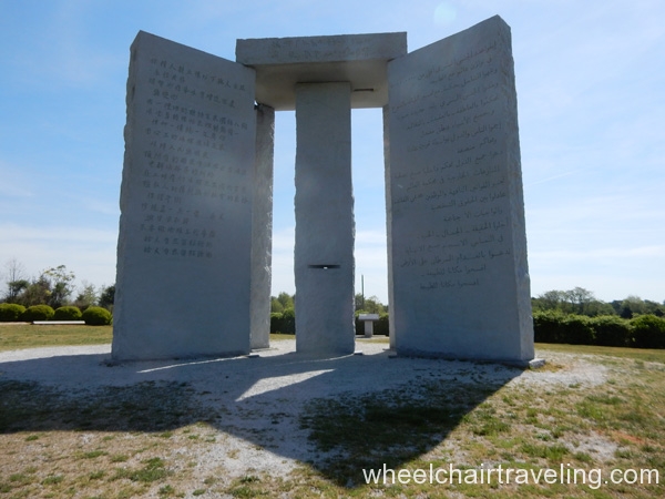 Georgia Guidestones is a mixture of Stonehenge and the 10 commandments found in the USA and created in the 1980s. It is located in what many refer to as “the middle of nowhere,” somewhat close to the boarder of South Carolina, over 2 hours away from Atlanta. A few parking spots are provided on a gravel lot and a barrier-free entrance leads onto the grass lawn. From the parking area to the Georgia Guidestones is only a couple hundred feet. A few informational signs explain the carefully crafted design of the Georgia Guidestones, including the astrological implements. A sealed time capsule lays next to the Georgia Guidestones, intriguing the curiosity of many. Pathways around the Georgia Guildestones are barrier-free and wide enough for most people.