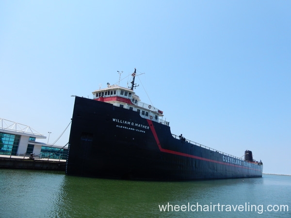 Rivergate Park on the boarder of the Cuyahoga River has a flat, paved walkway to stroll around. Lakeshore Blvd. is a great drive and a part of the Lake Erie Coastal Ohio Trail that stretches for about three-hundred miles (taking about eight hours to drive) and has a few historical landmarks. Many beautiful mansions can be seen along this road in Cleveland, and portions of this you can definitely wheel. Another recommended area is around the Rock and Roll Hall of Fame and Museum. The pathway around here is nearly level with open views of the lake. There is a Steamship you can tour; once entrance has a ramp. The ship is the Steamship William G. Mather Museum and is open May-October. Most of the pathway around here is cobblestone-type, which gets bumpy.