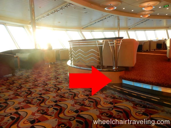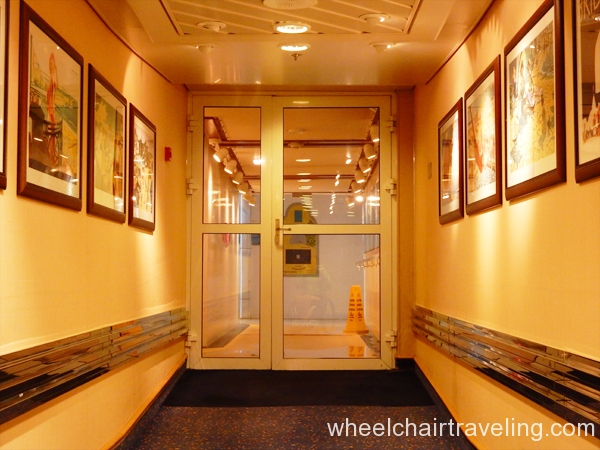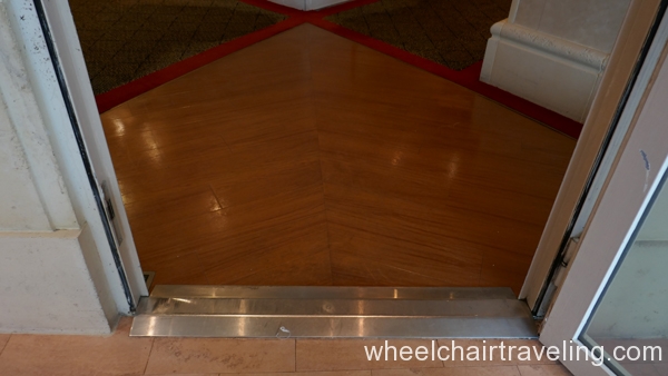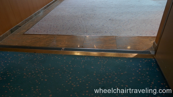 Automatic doors are not located everywhere, and every bar is not wheelchair friendly. On a cruise ship, there are usually a few pools and hot tubs/spas, but all do not have a ramp or lift; on some cruise ships, there are none. Also, the thick carpeting in many areas of the ship can be tiring for manual wheelchairs after a while. Some of the transitions in the doorways and hallways are a few inches wide and high; low-lying undercarriages on wheelchairs and scooters may get stuck or scrape.