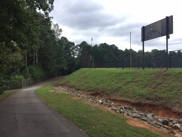 I would say mainly people come here for the sports, but I come here for the nice almost a mile loop under the trees paved walkway. Keep in mind again in Georgia every path you’re going to need a power wheelchair because there’s lots of hills. Also roots coming up on the concrete and you can see that in the pictures.