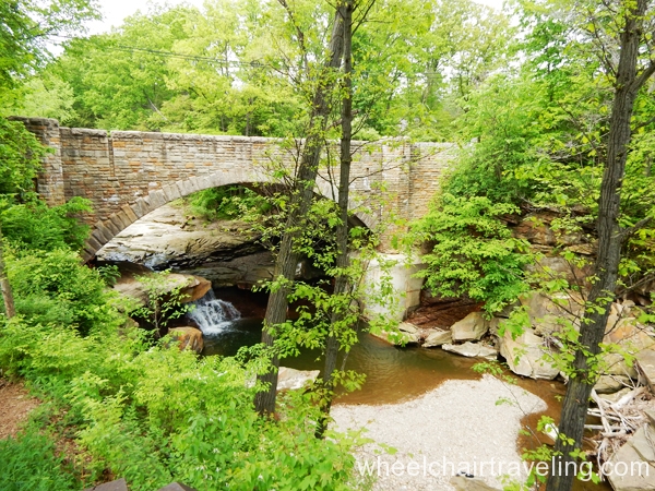 Another noteworthy overlook is in the Brecksville Reservation area on the border of the park along the Chippewa Creek Gorge. Designated accessible parking is directly in front of a boardwalk platform that overlooks a stone bridge where young rock jumpers often are seen taking dives. A picnic bench is also on the level platform. The trashcan is on the edge of the parking lot. A paved trail leads from the main road to the parking lot but is sloped (more than 10 degrees).