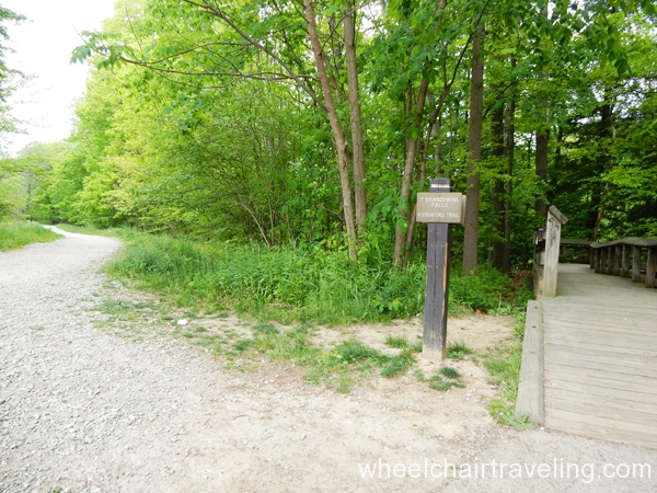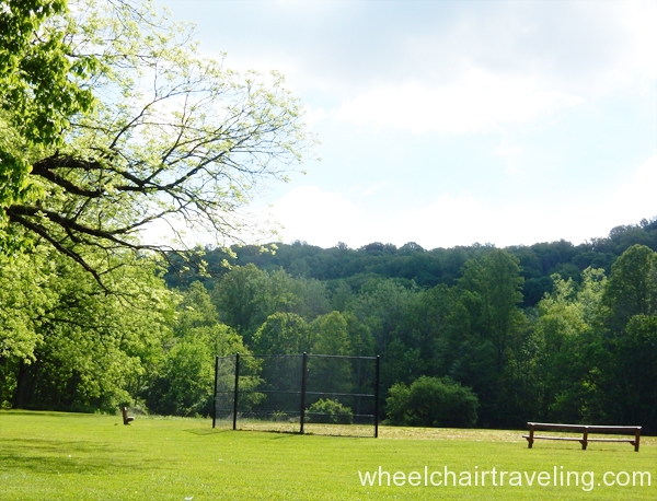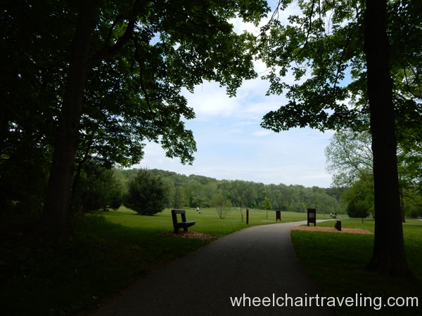 The Cleveland Metroparks, also known as the Emerald Necklace, has a number of trails that have been classified as accessible and there are even more options with power assist due to hills and inclines, see here. In the Brecksville Reservation area, there is a scenic loop that starts at a parking lot and then travels through a meadow and past both the Harriet Keeler Memorial and the Brecksville Nature. At the meadow is a viewing platform with a ramp, but the top level of the platform has stairs and is where the informational board is located. Access to paved, designated parking was available at the closest location and right next to a fully modified picnic table. More picnic table options are available in this initial area and beyond.