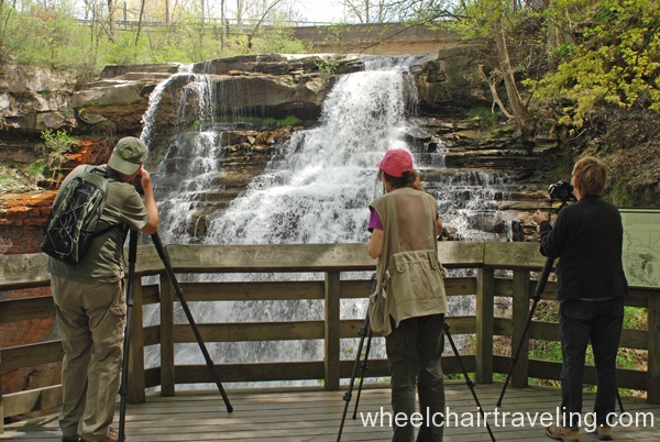 Off the road in the Bedford Reservation in the northeast section of the park. Operated by Cleveland Metroparks, a handicapped parking spot leads visitors onto a short boardwalk platform overlooking the Tinkers Creek Gorge. Handrails on each side are provided with ample maneuvering space at the end. The parking spot to the platform is only a few feet and is almost comply level (less than 2 degrees).