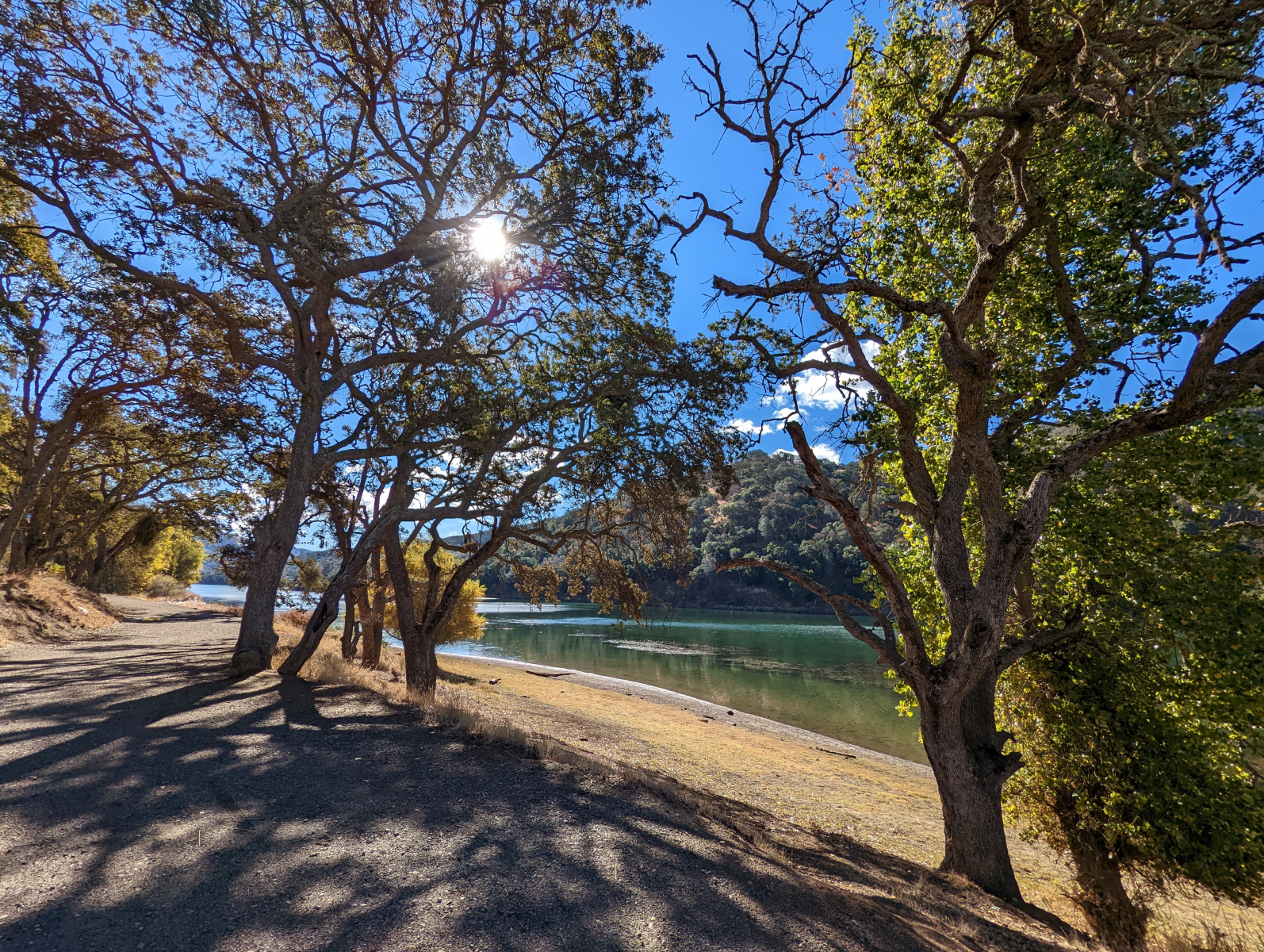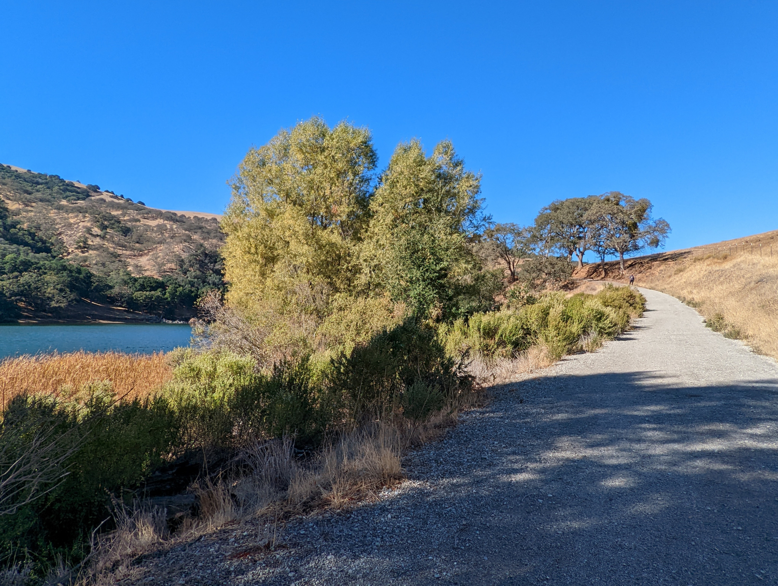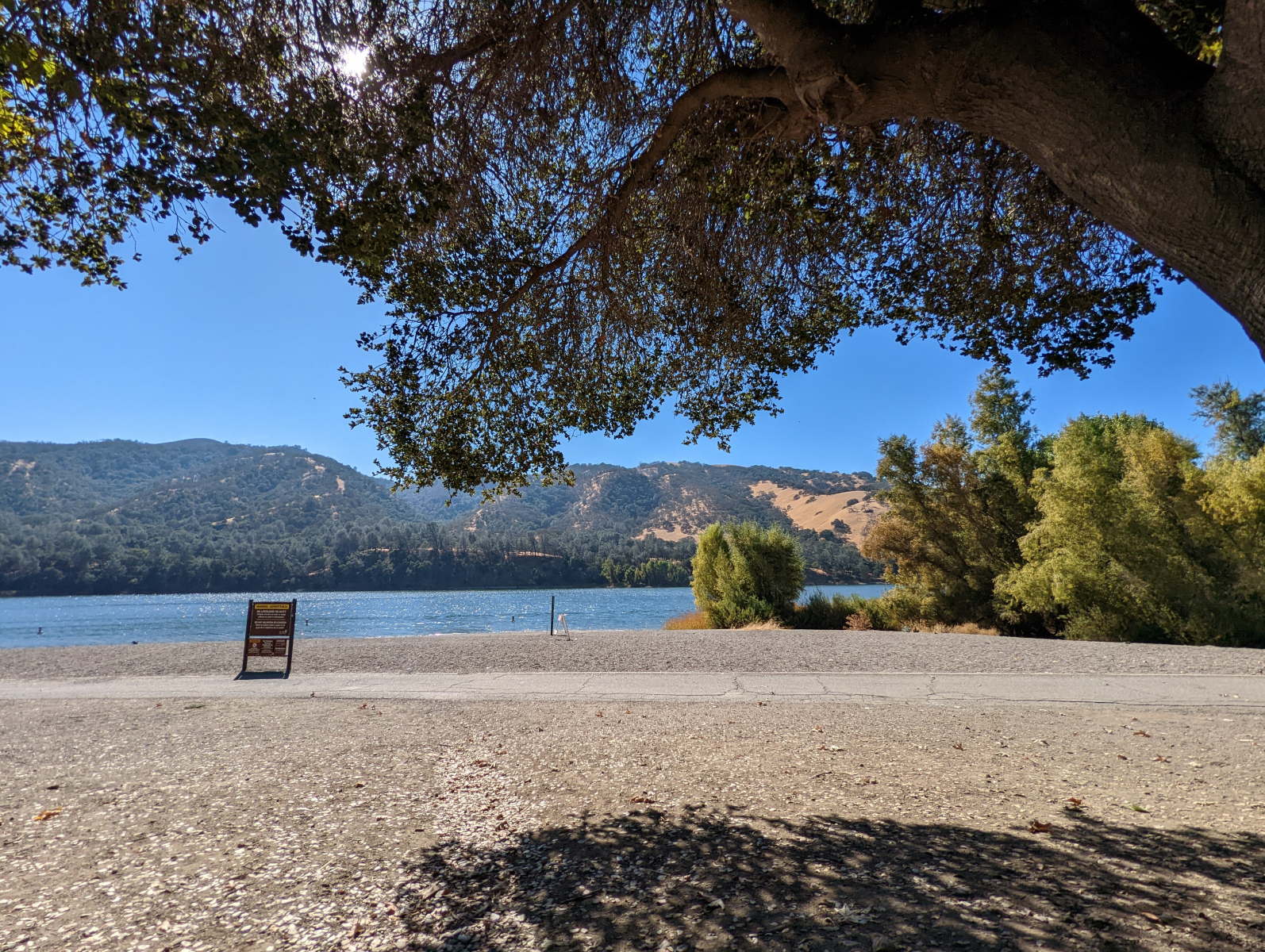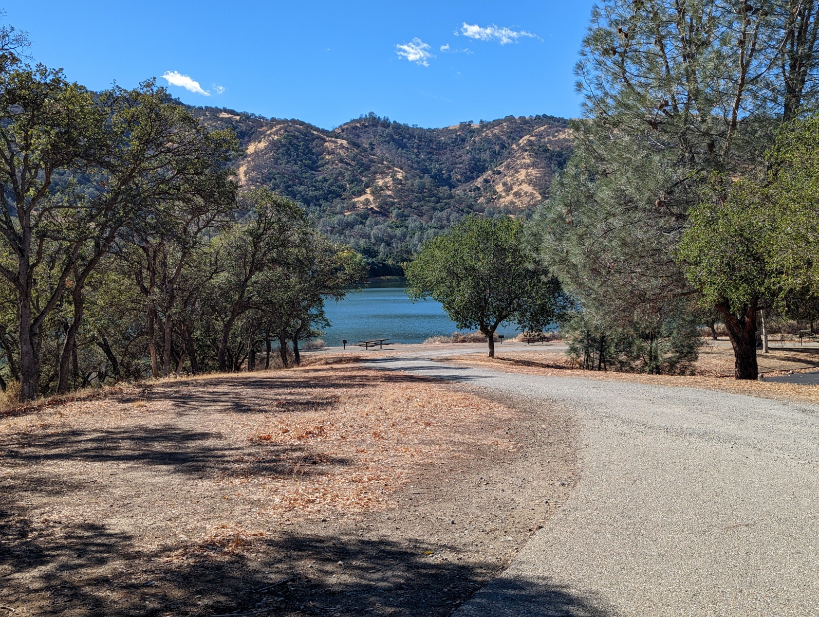 Partially paved for a little over a half mile with little to no shade. Three parking lots on the east side have access points to the East Shore Trail. Trees and picnic tables are off the trail. A wooden bridge by the Eagles View Group Camp has a lip of a few inches, and also watch out for large gaps.