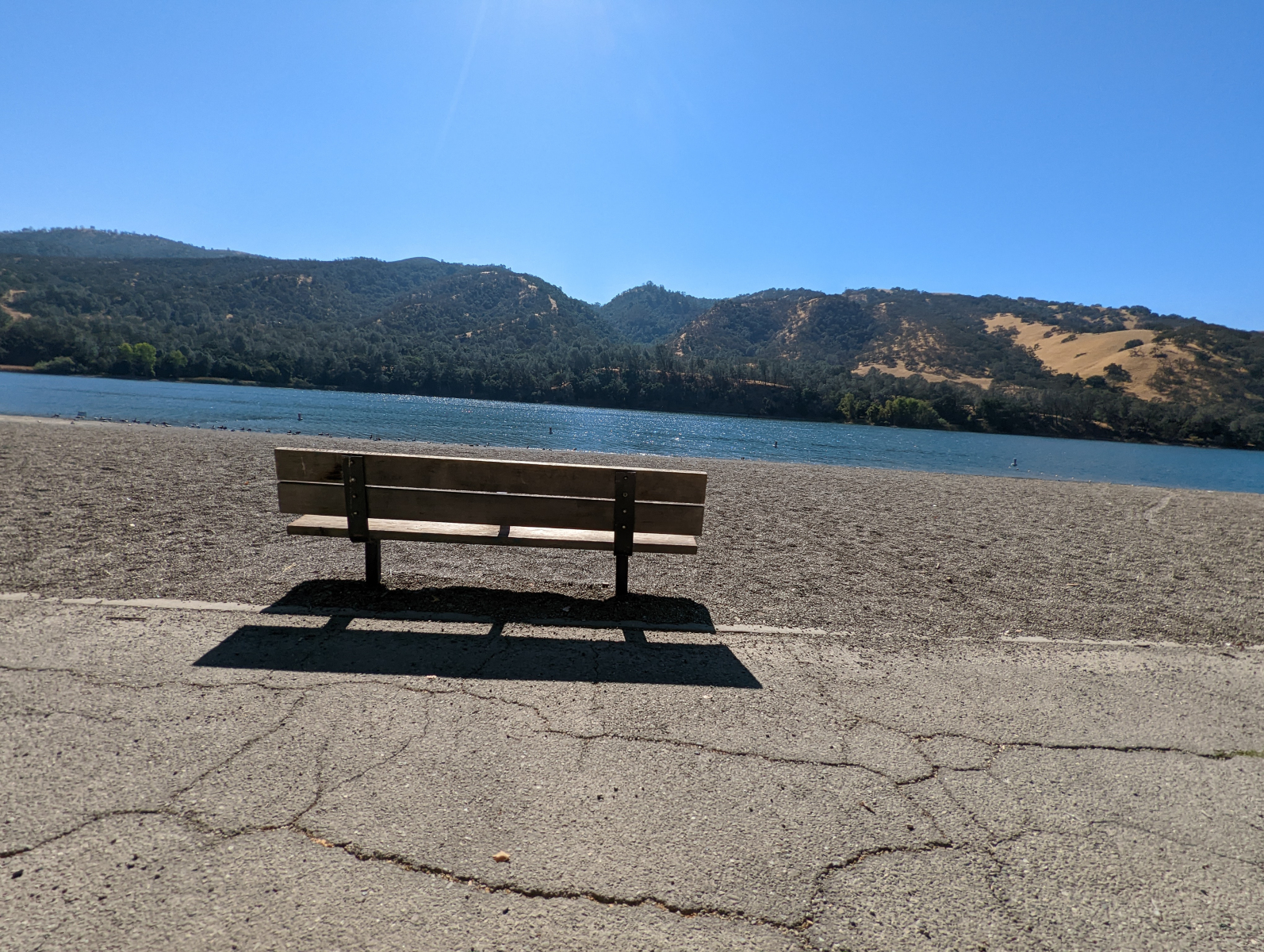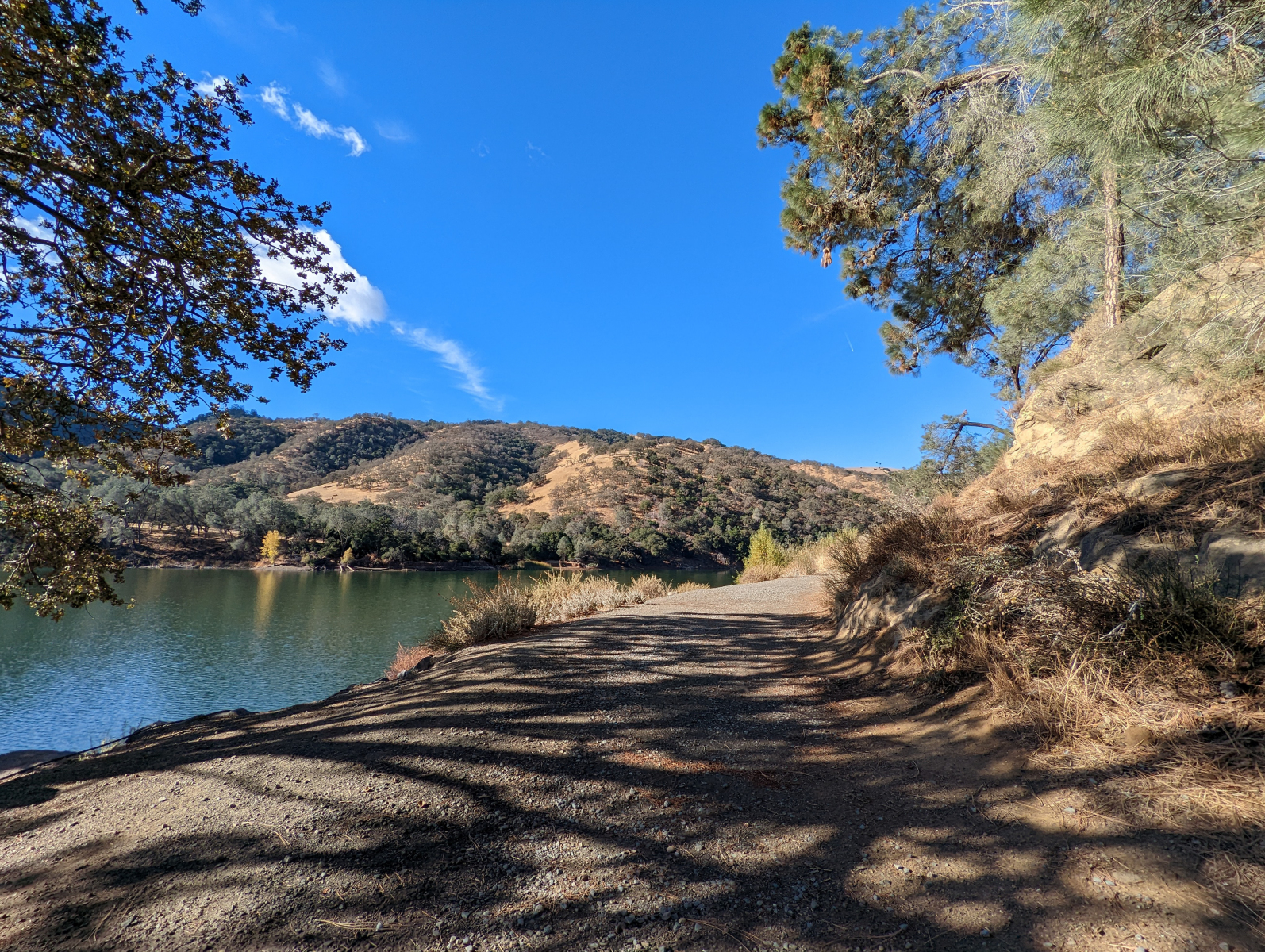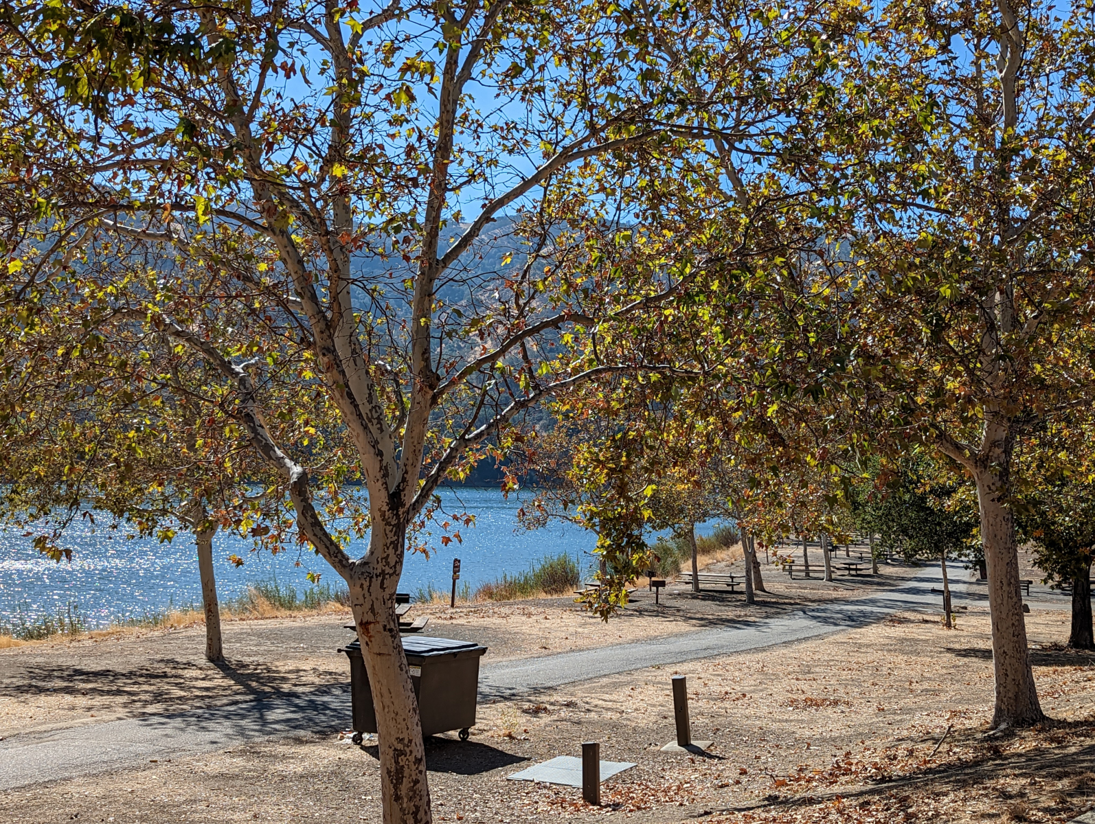 Partially paved for a little over a half mile with little to no shade. Three parking lots on the east side have access points to the East Shore Trail. Trees and picnic tables are off the trail. A wooden bridge by the Eagles View Group Camp has a lip of a few inches, and also watch out for large gaps.