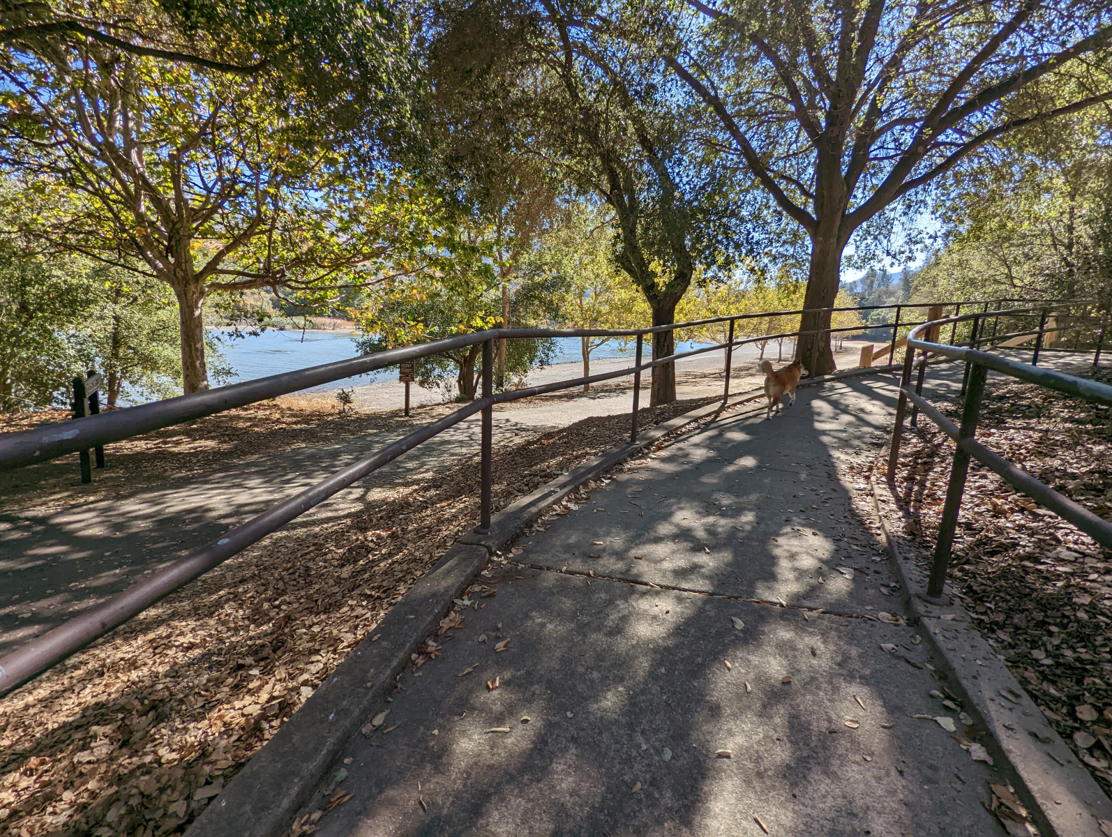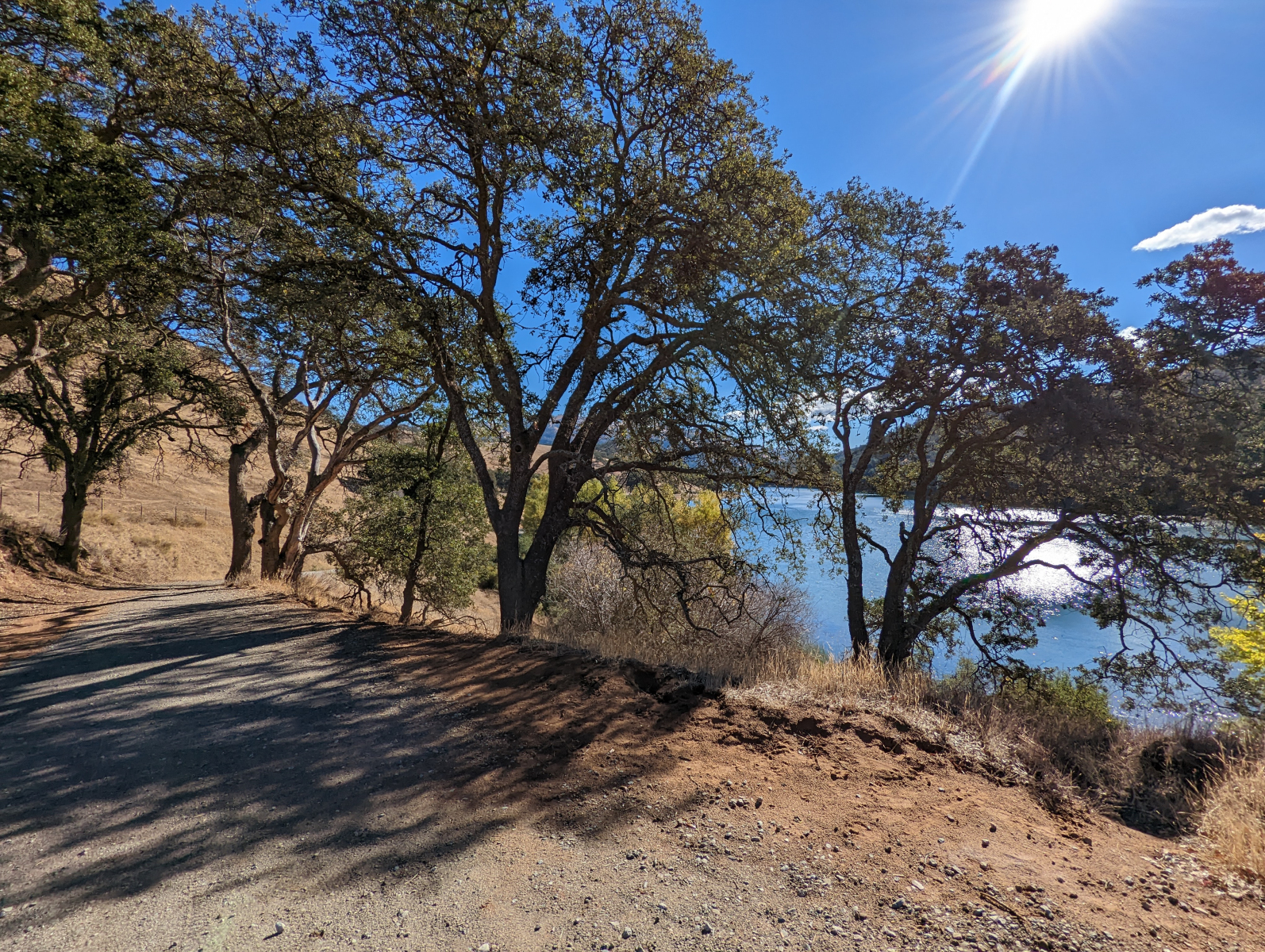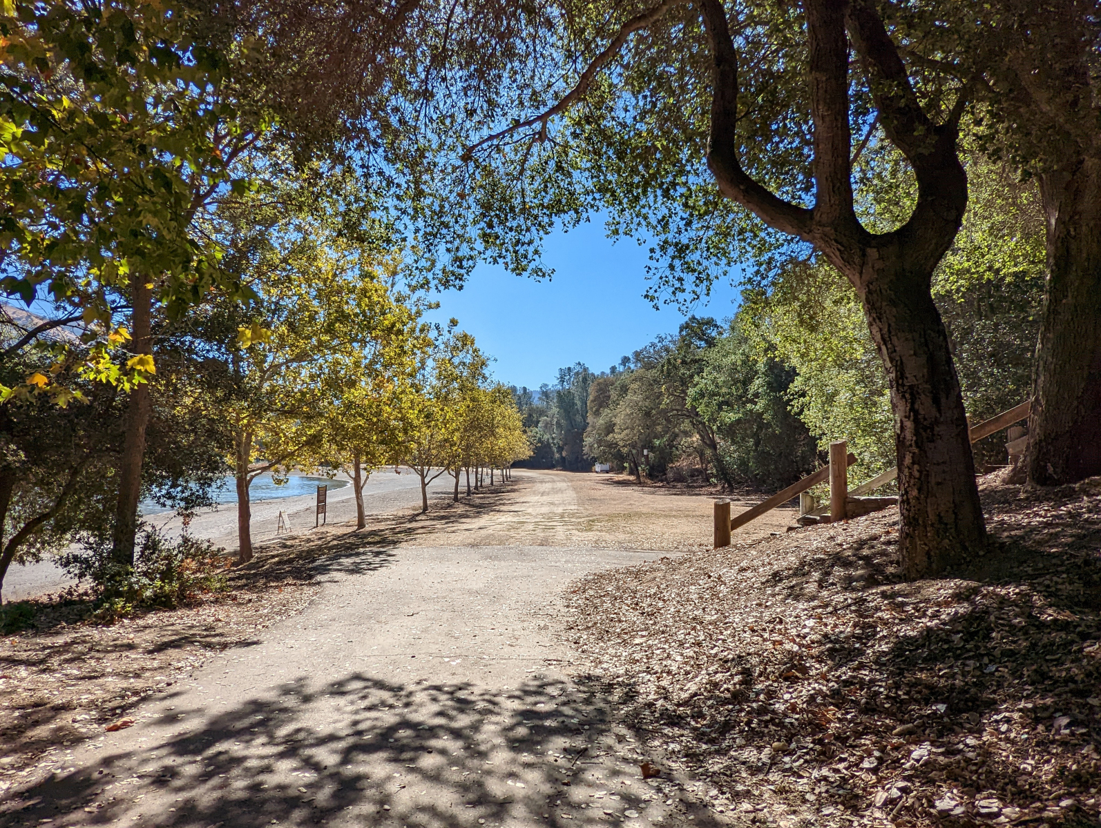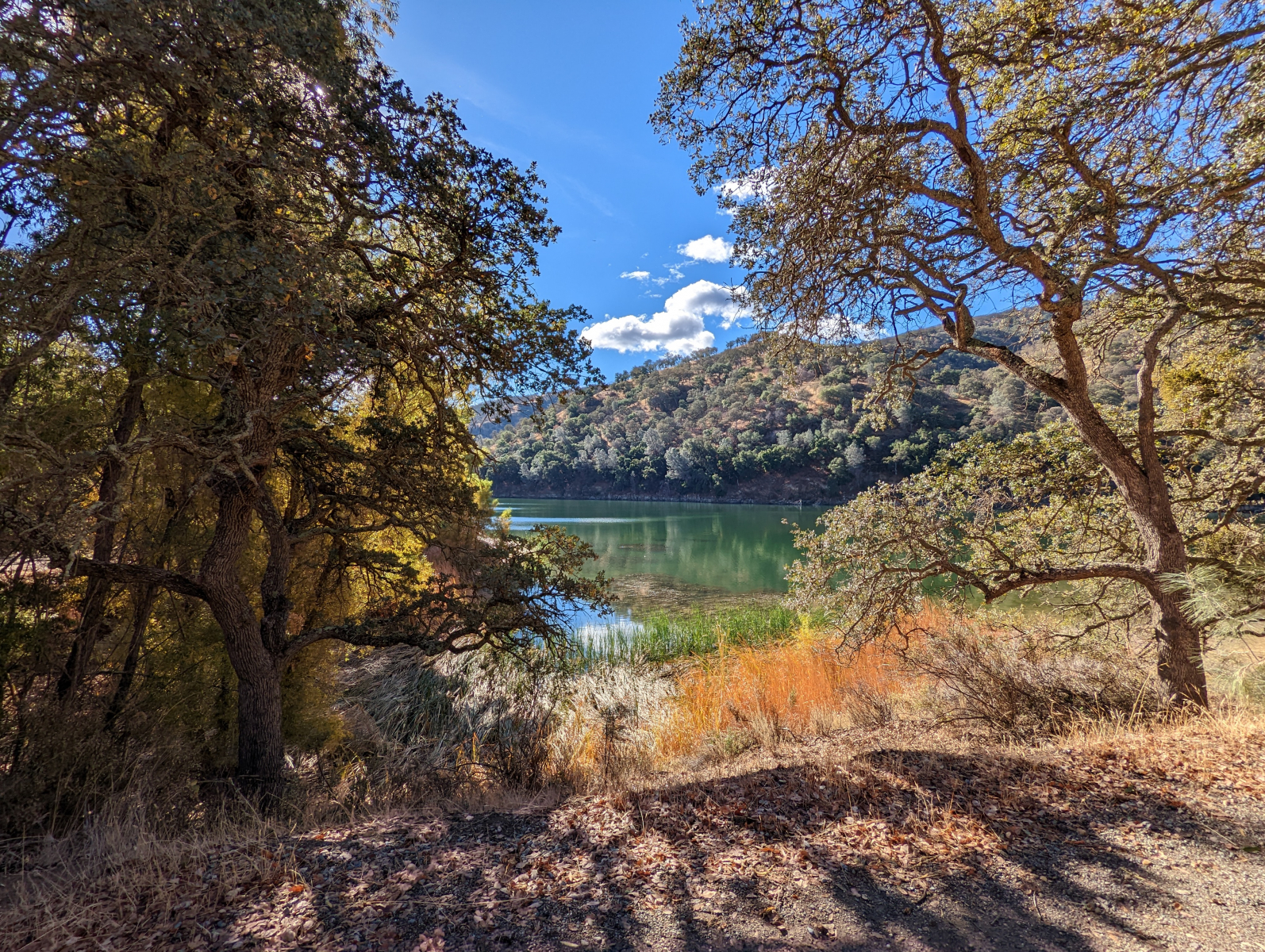 Partially paved for a little over a half mile with little to no shade. Three parking lots on the east side have access points to the East Shore Trail. Trees and picnic tables are off the trail. A wooden bridge by the Eagles View Group Camp has a lip of a few inches, and also watch out for large gaps.
