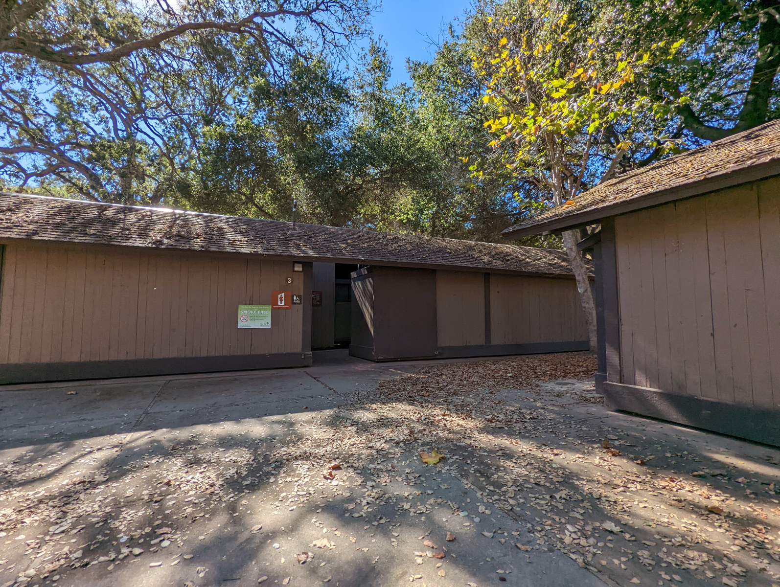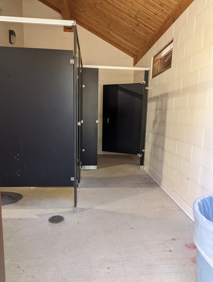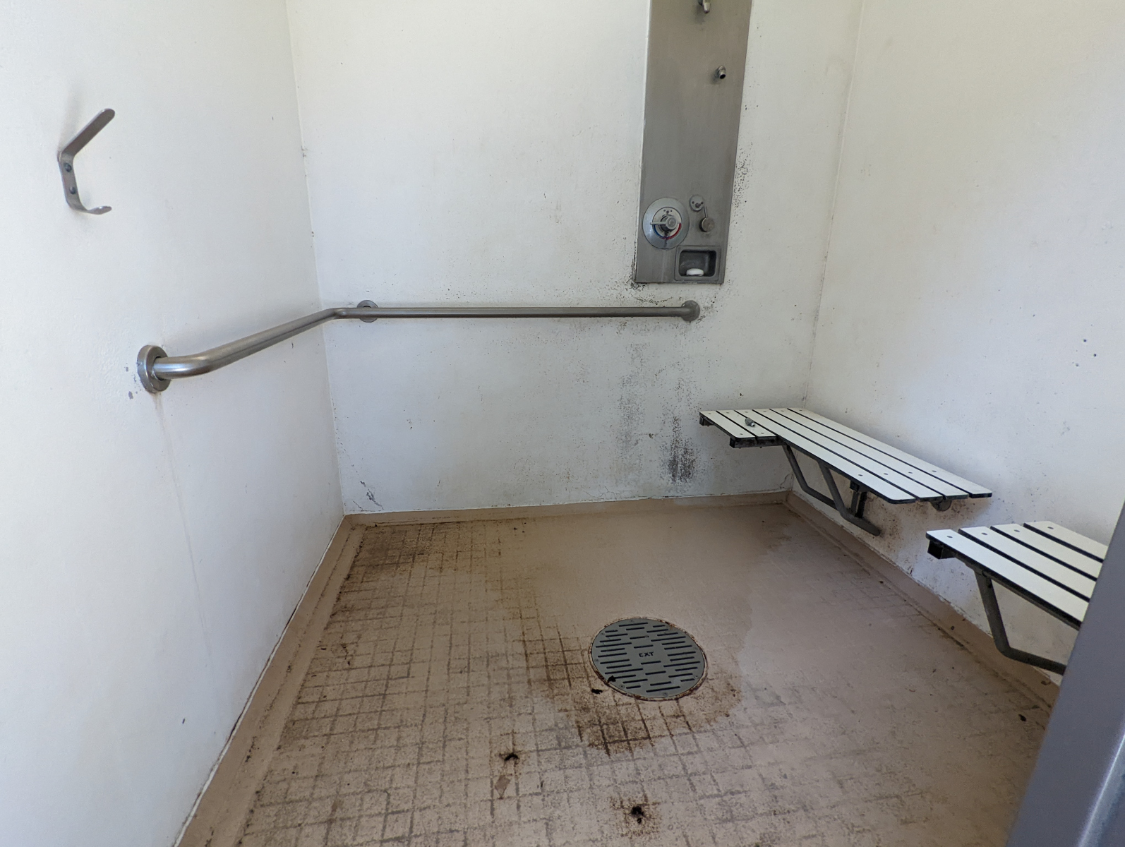 - Toilets + Showers: A wheelchair accessible toilet and roll-in shower are located just across from the tent cabins. One accessible parking spot is located in front. The shower is barrier-free but no shower bench or hand-held shower nozzle are provided. There is also a wheelchair accessible stall with a flush toilet. On the opposite side of this campground, near campsite #80, is a wheelchair accessible shower with a roll-in shower, mounted bench, and hand-held shower nozzle.