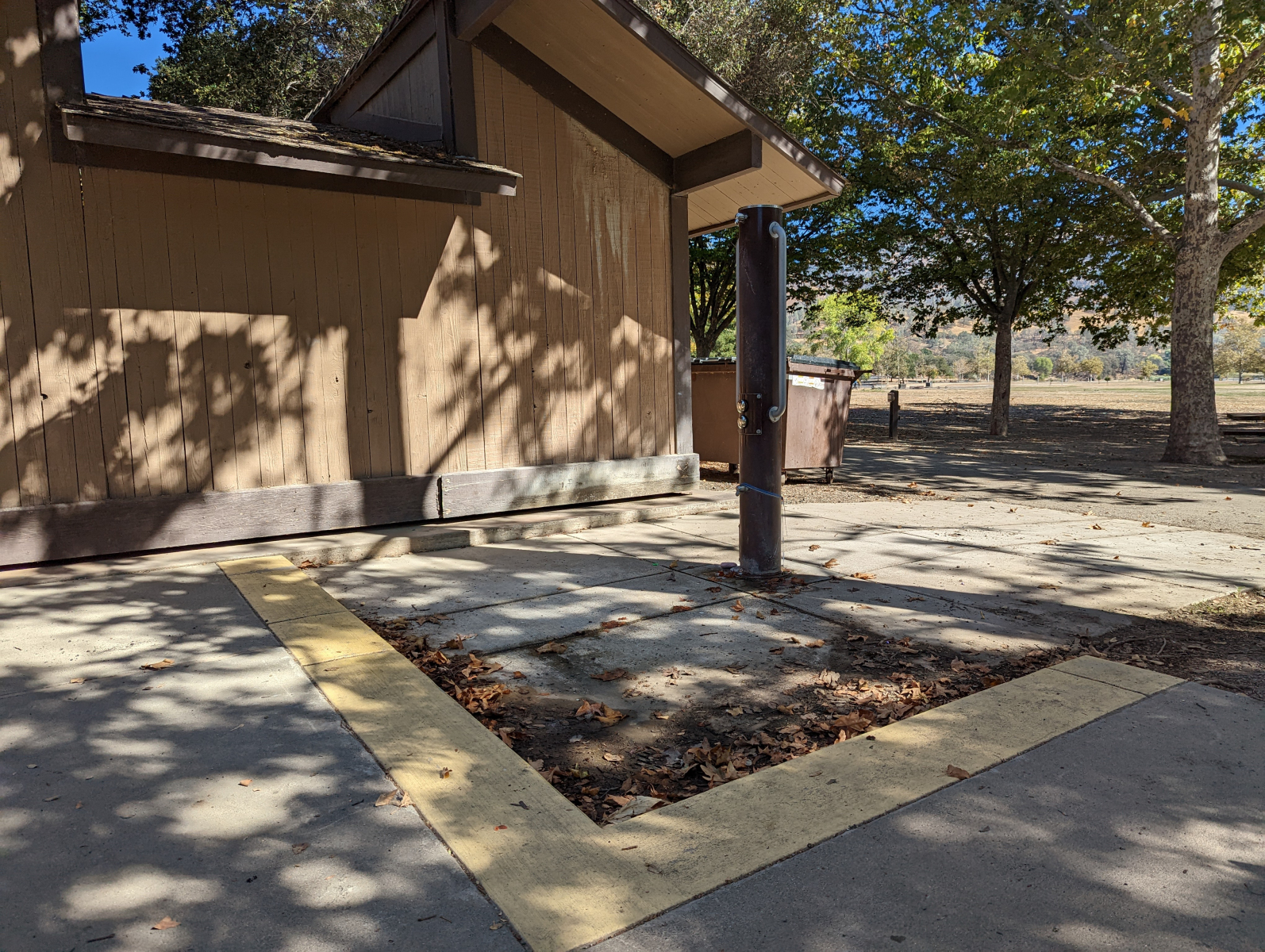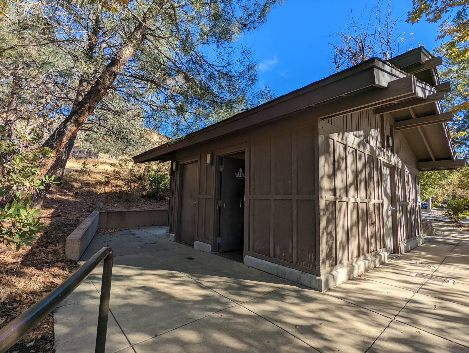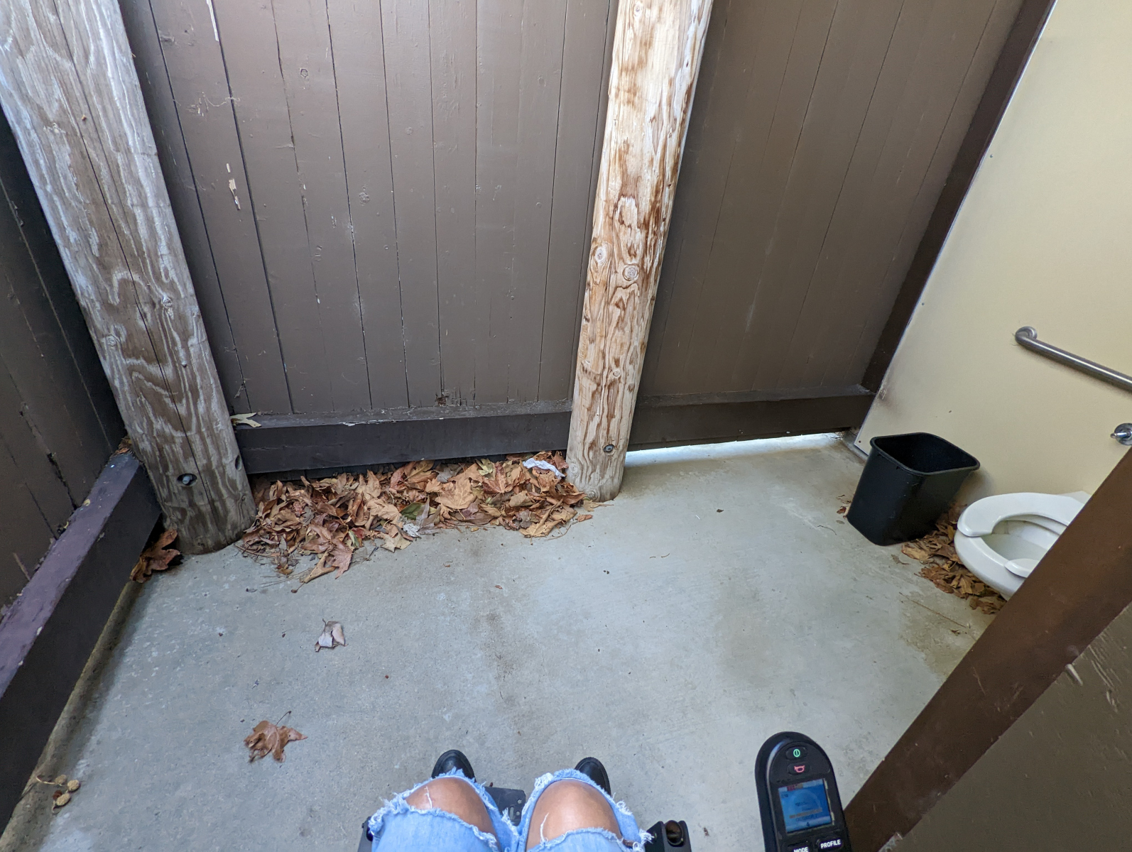 - Toilets + Showers: A wheelchair accessible toilet and roll-in shower are located just across from the tent cabins. One accessible parking spot is located in front. The shower is barrier-free but no shower bench or hand-held shower nozzle are provided. There is also a wheelchair accessible stall with a flush toilet. On the opposite side of this campground, near campsite #80, is a wheelchair accessible shower with a roll-in shower, mounted bench, and hand-held shower nozzle.