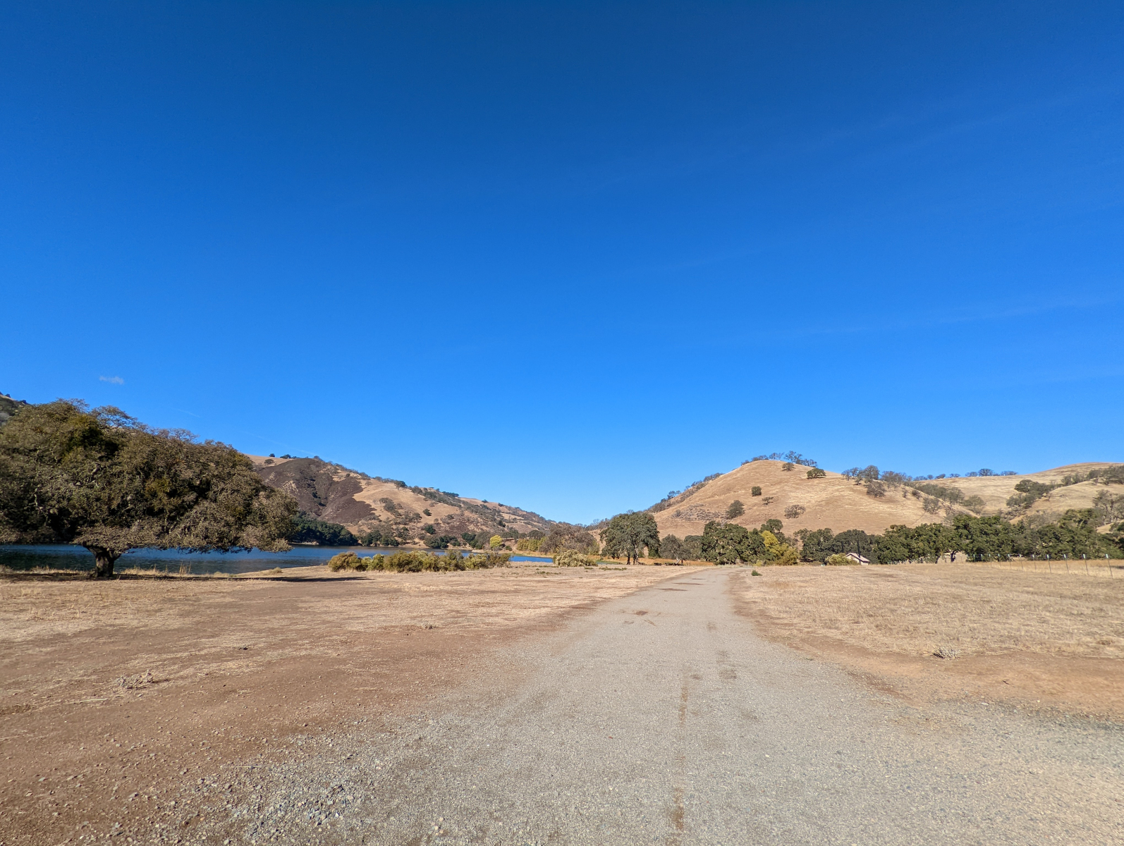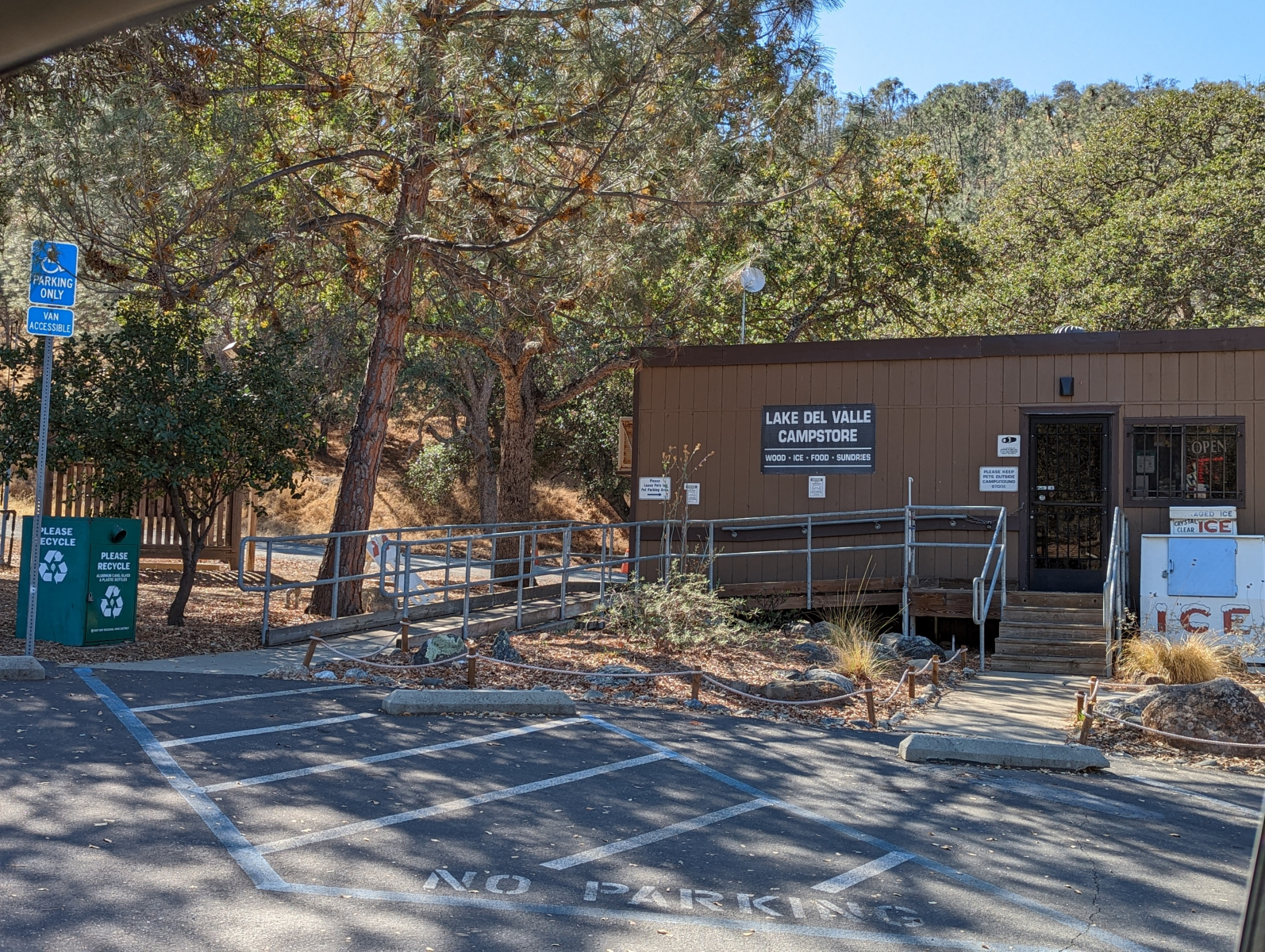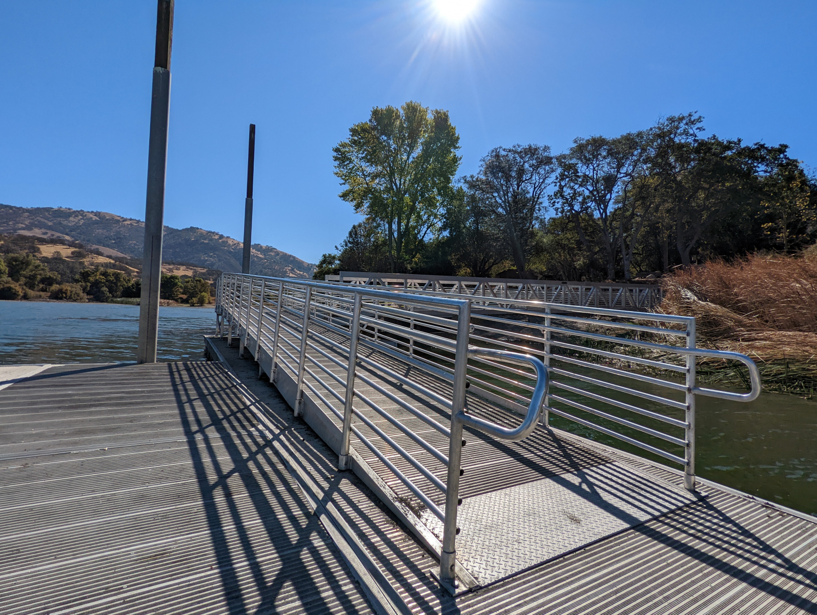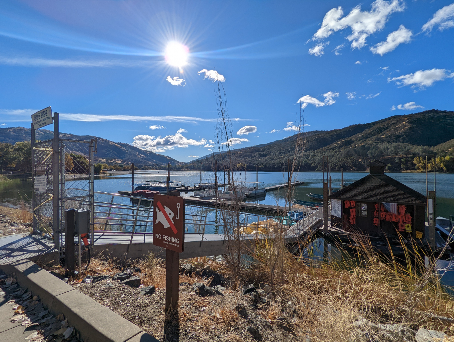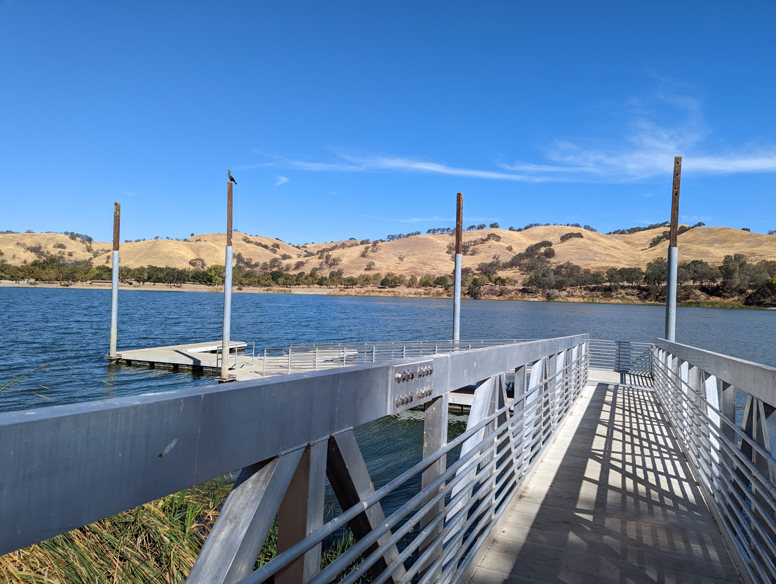 The Lake Del Valle fishing dock is located near the Visitor Center by the Vista del Lago picnic area. A paved ramp with handrails leads down to the level, metal platform with dock points. One handrail is on the dock but the rest is open.