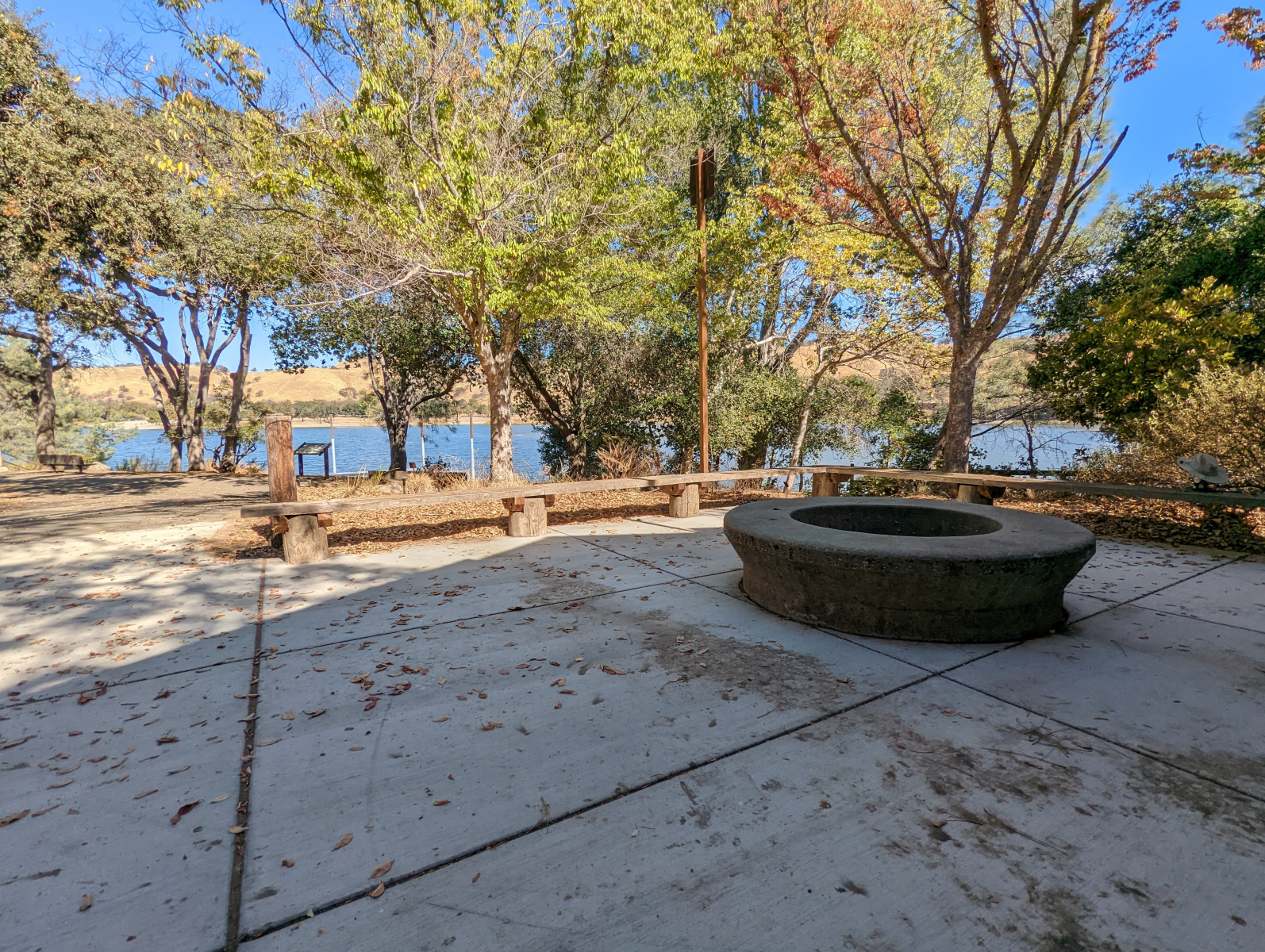 Drive past the kiosk and over the bridge, head right to the west side of Del Valle Lake (left goes to campgrounds) to the Visitor Center where the picnic area Vista del Lago is located. A firepit is by the Visitor Center on a paved platform overlooking the lake, and a paved ramp leads from here to the picnicking area where there are four tables on a paved surface and each has a raised cooking grill.