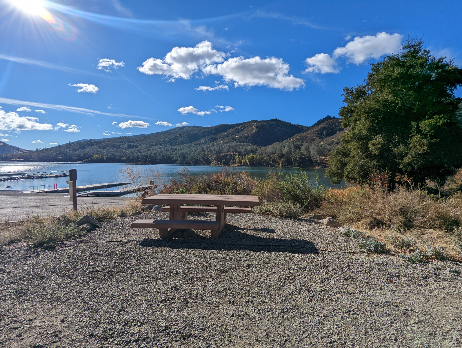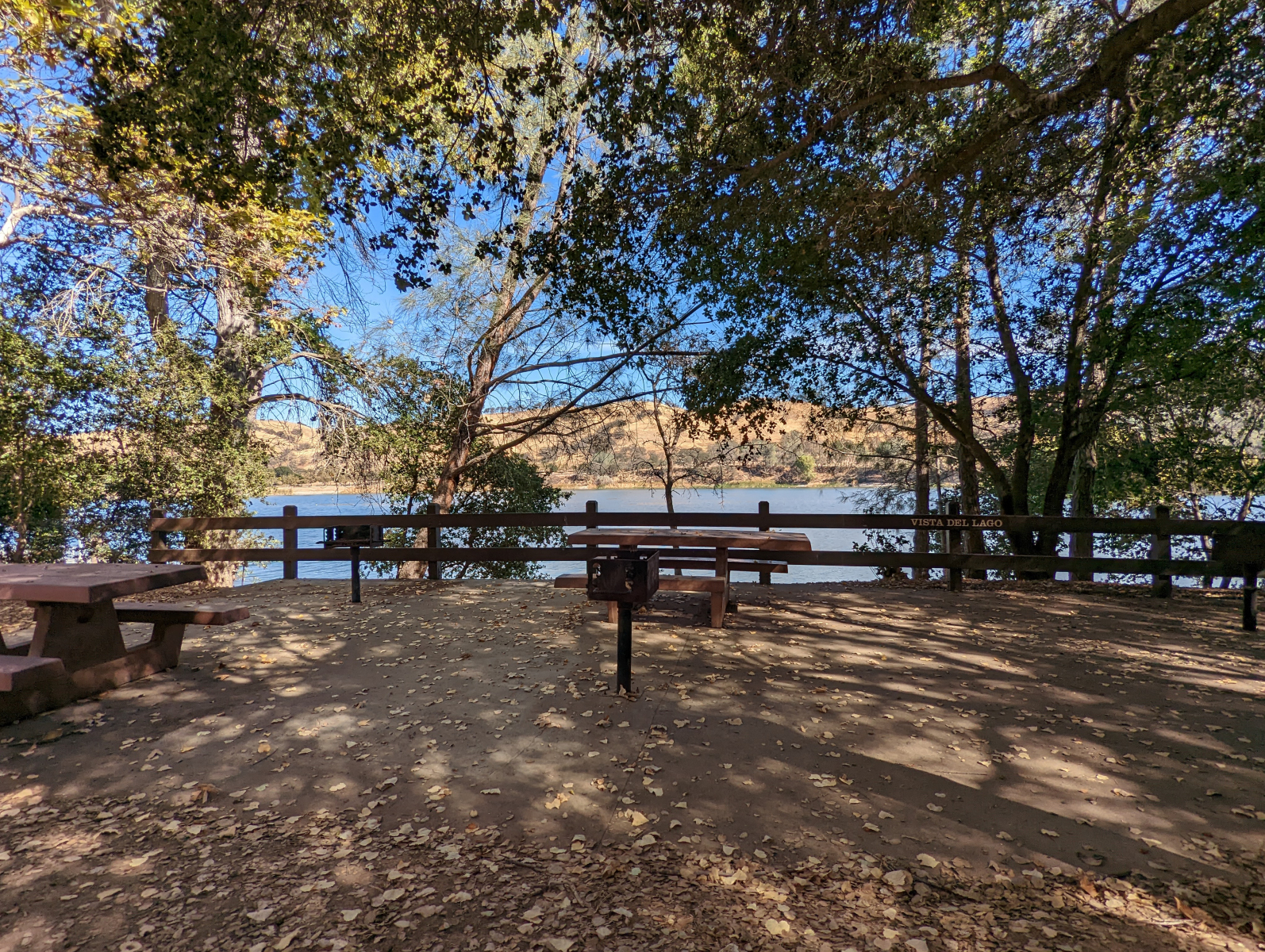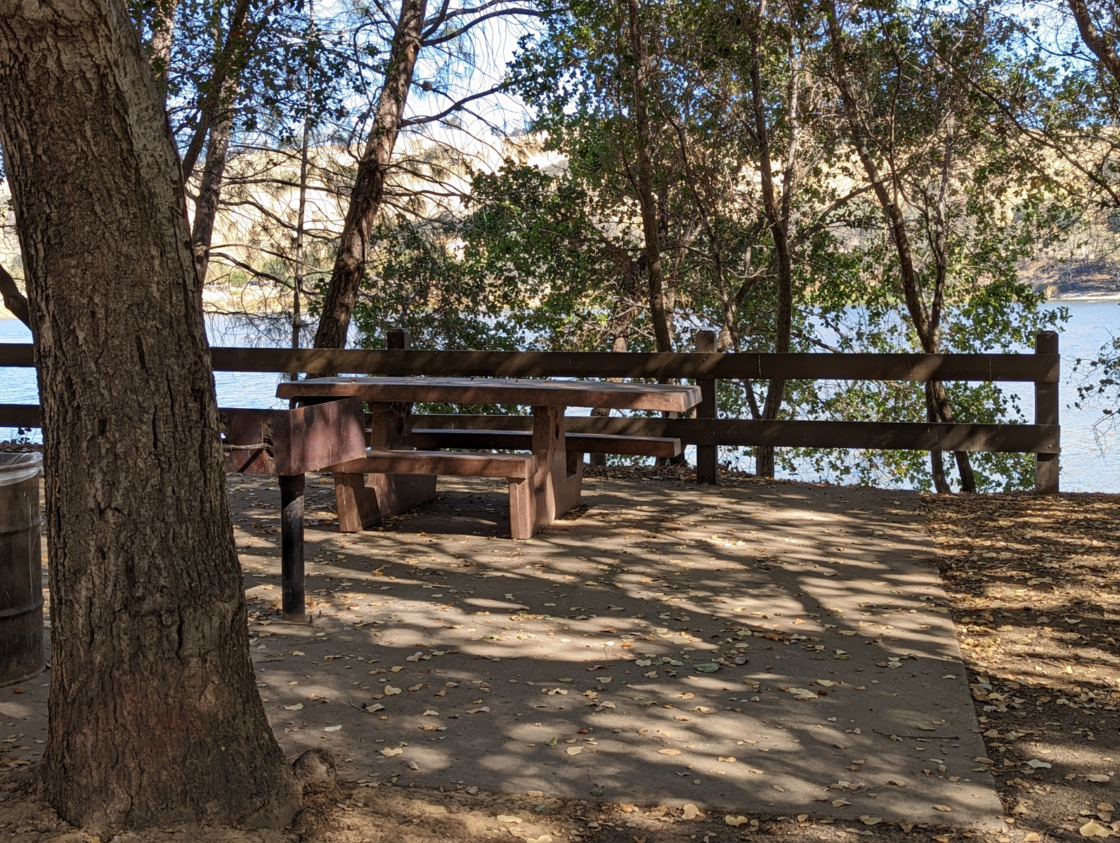 At the gate kiosk, turn right for the fastest and closest access to the lake. Almost immediately, visitors will see picnic tables along the lake and nearby. Some of these picnic tables have raised barbeque grills next to them. Most picnic tables are on a dirt surface, like at Coyote Corner. However, in the Beach View area, by the grill, are wheelchair accessible picnic tables. Three tables are on a paved surface, each with a designated spot for a wheelchair. Two of the three tables have a raised BBQ. Eagles View Group Camp, at the start of the East Side, has a few regular tables on a firm surface, but are located down a small hill.