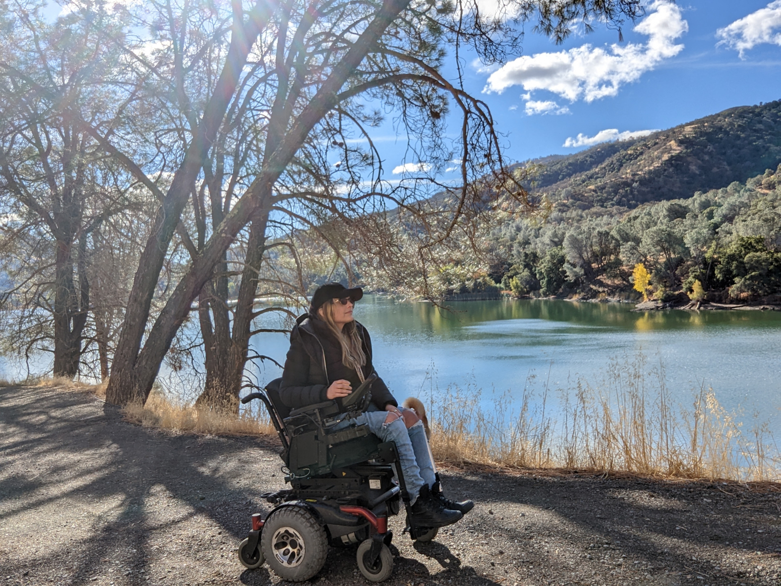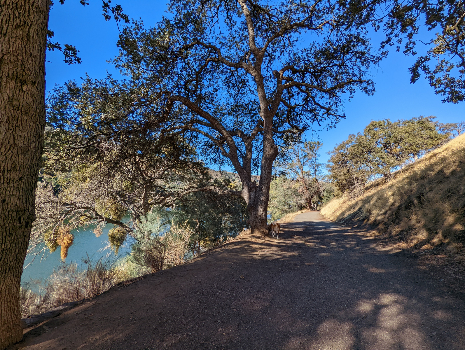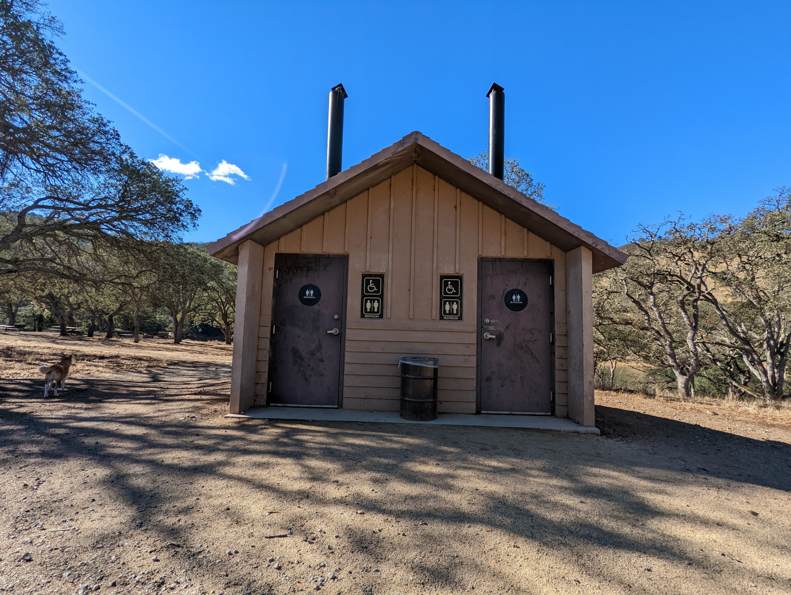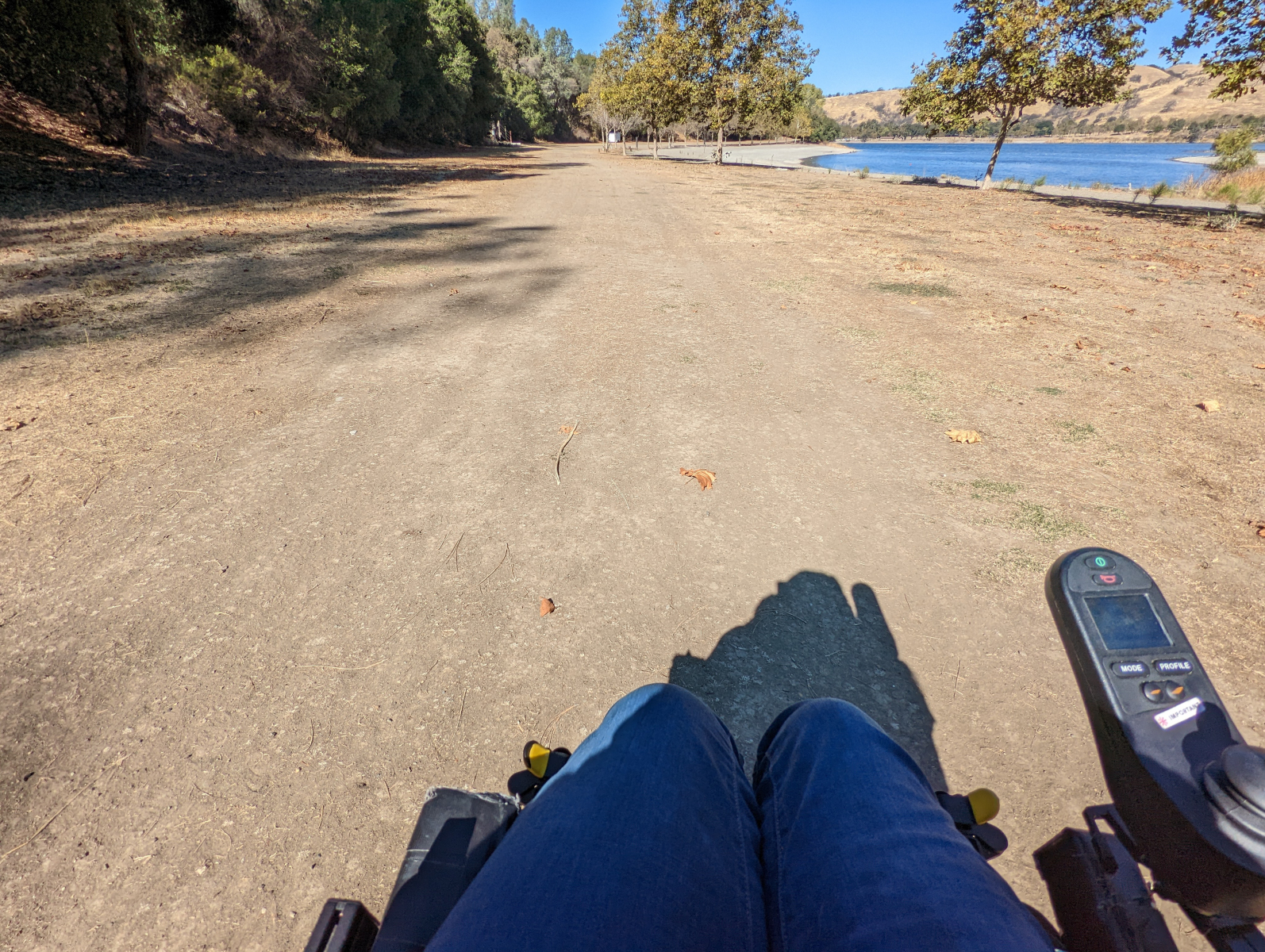 Also on the East Shore side, by the marina is the Dog Run Trail, a 4+ foot wide dirt trail along Del Valle Lake. Near the gated trailhead is a picnic table with an open space for a wheelchair on a thick gravel surface. After passing through the gate, a gradual incline wraps around the hillside. Hiking this trail with power assistance is recommended but not required for some. The Dog Run Trail becomes more level and continues this way to the Hetch Hetchy Group Campsite where there are two wheelchair accessible vaulted toilets. Past this point, the trail becomes the East Shore Trail once again. A minor hill followed by a larger one comes next, and if able to continue, the wide trail ends at the Venados Group Campsite where there is another wheelchair accessible vaulted toilet. Extending the hike to this point adds a little over a 1/2 mile more.