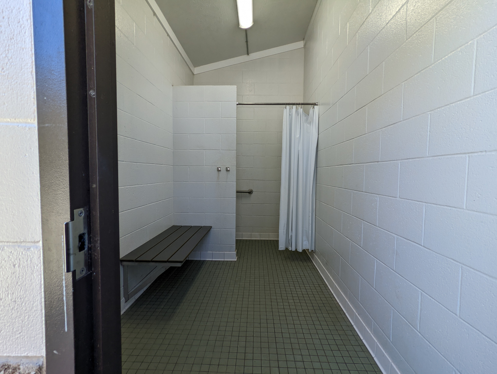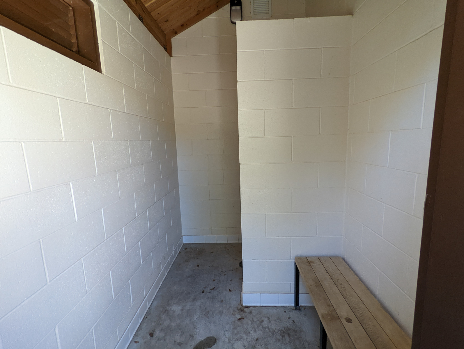 - Toilets + Showers: Near Wild Turkey Group Camp are accessible flush toilets and the showers are located by the Family Campground. One wheelchair accessible roll-in shower is available with a mounted, flip-down bench, but without a hand-held shower nozzle.