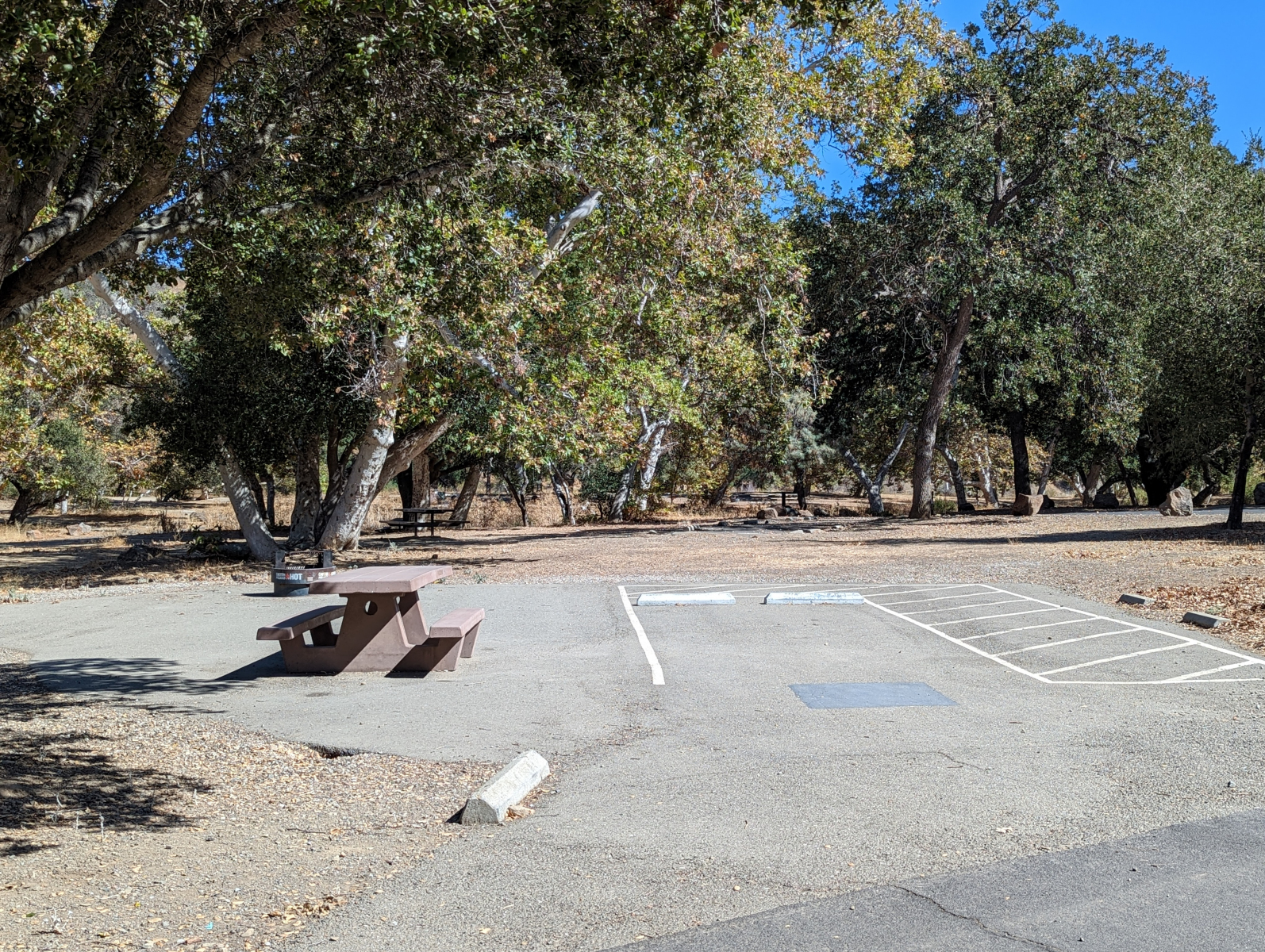- Campsites: At the Family Campground, one large campsite is on a paved platform with a raised cooking grill.