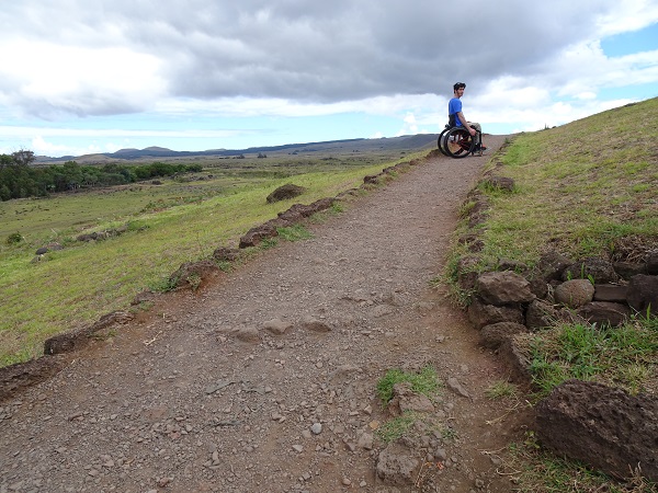 There was no designated, handicapped parking on the island; not in the town or at attractions. Most of the attractions are accessible to a point. When I say “accessible,” it means because of the barrier-free, hard-packed dirt paths with some overlaying rocks. Some paths were hilly, but often, strangers usually asked if we needed help going up hills. Many of the Moai statues can be seen from the road or parking lot. You cannot touch the Moai, but you can get very close at some of the sites.