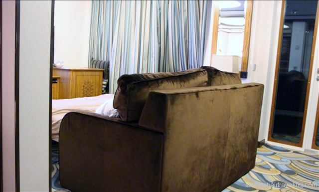 For our cruise on the Fantasy, we booked an Accessible 1-bedroom Concierge Family Stateroom with Verandah and I had high expectations as my previous Disney cruise was in the same type of room, only it wasn’t listed as accessible but had every accessible feature you would expect to find including plenty of space. Upon entering our stateroom and looking around, we noticed a couch blocking the entrance to the living room and what appeared to be my bed for this cruise, stowed in the wall that when extended would provide no room for my wheelchair to maneuver around.