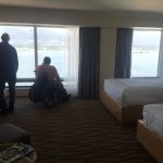 These accessible rooms come in studio or suite size with either two doubles, a queen or king bed. The modified rooms with double beds are #421, #521 and #520. Both studios and suites include a kitchenette but with no special modifications; the suite has a small seating area. The hallway and room is generally more spacious in a suite than a regular room; extra furniture can be removed if needed. Lamps and light switches have also be carefully selected and place to ensure enough power can be accessed.
