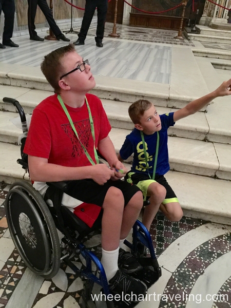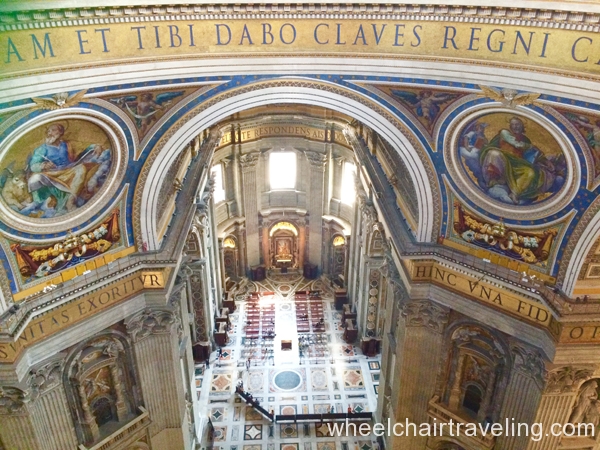 Wheelchair Accessibility: On the right of St. Peter’s square is a line to get through security and into the basilica. Skip the line and go strait to the wheelchair entrance. They will take you through security without waiting. From there, go all way down the corridor to the door on the far left. There is a ramp to get into the Basilica. Once inside it is completely accessible. If you are so inclined to go up to the top for a better view, do it!!! But, know that wheelchairs are only able to go to the roof, (free of charge) Stairs are the only access to get to the top of the dome. The roof of the Basilica has lots of shade, a nice breeze, and large wheelchair accessible bathrooms.