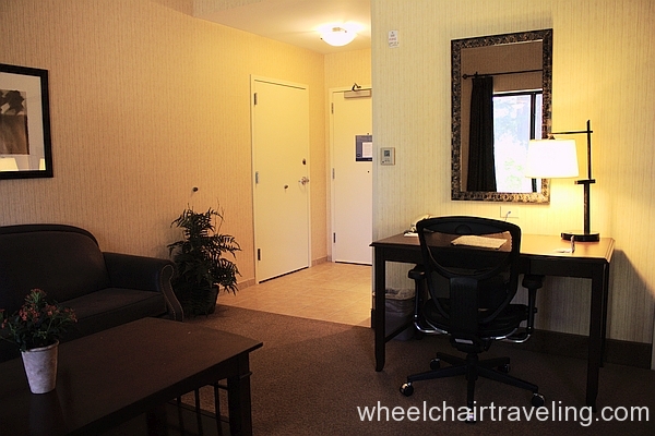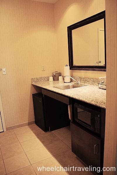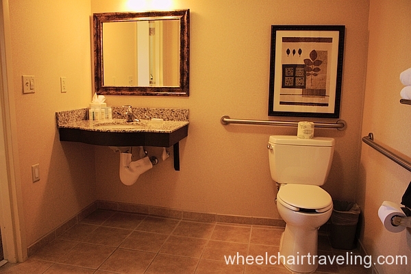 The Hampton Inn was a pretty nice place, more of an upscale, newly remodeled look. The room I got was a roll in shower room. There was a lot of space in the room so moving around was easy. The bed was a king and could be accessed on both sides. The height of the bed is pretty tall. The bathroom was set up nicely. The only complaint about the bathroom was that there was no lighting in the shower area.