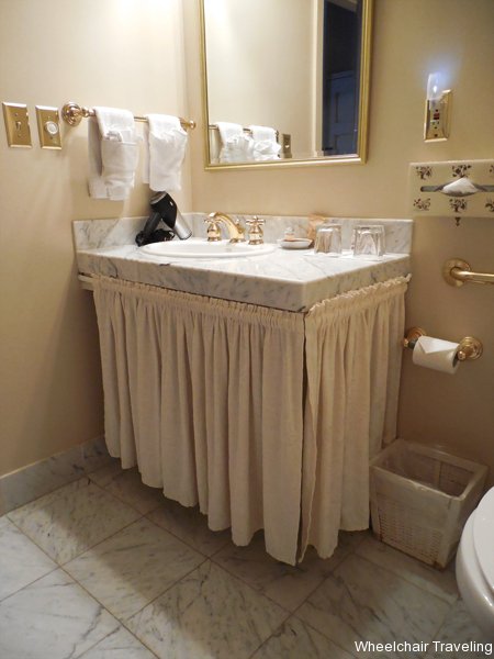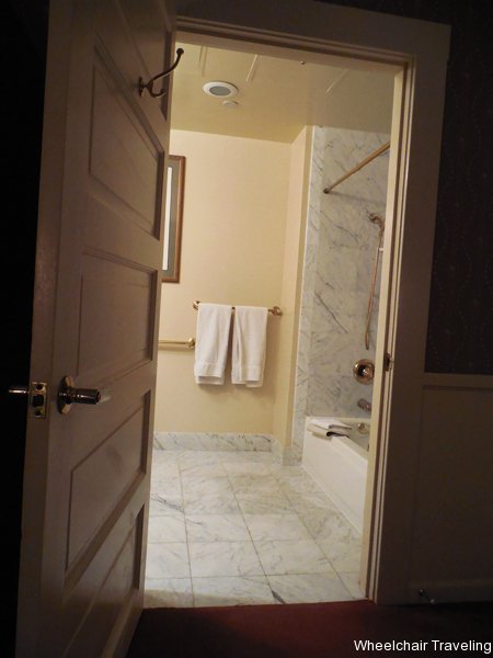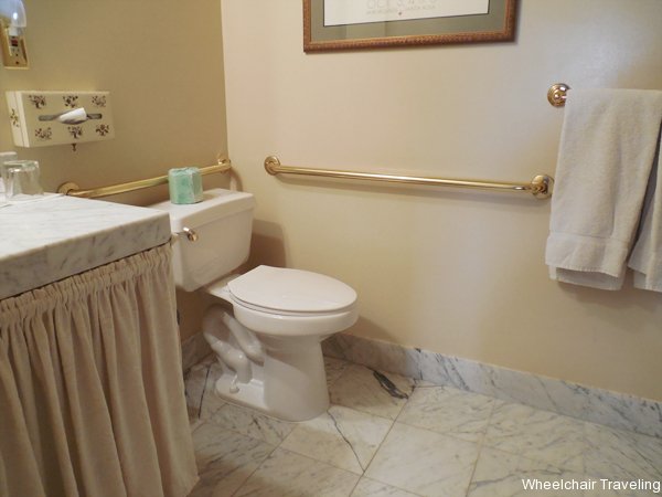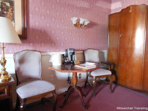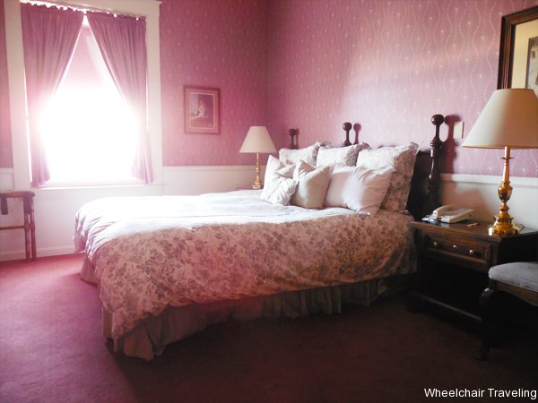 Although there are no automatic main doors or lowered counter at check-in, there is a wheelchair accessible restroom in the lobby. Around the corner from the check-in desk is a dining area where continental breakfast is served from 7-9am. A total of three guest rooms have been modified for better access: #20 (King), #29 (King Suite), and #58 (Double). All of these rooms have a bathroom with a tub setup. An elevator, big enough for two manual chairs, takes guests to rooms #20 and #29. Room #58 is located in Carriage House across the street from the main hotel. Accessing this room first requires going through a locked metal gate, which can be challenging for some. Carpet is nearly everywhere throughout the hotel.