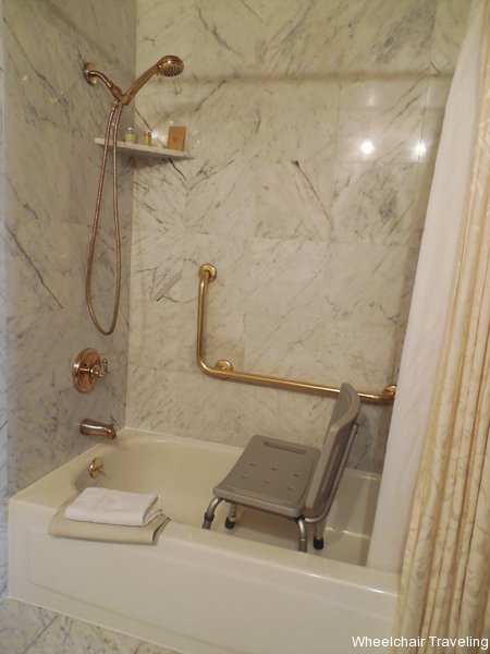 In the bathroom, the bathtub is equipped with a hand-held shower nozzle, grab-bars, and a portable shower seat with a back. The shelf is not accessible to those who cannot stand up in the bathtub. The bathroom also has a roll-up sink and a toilet with grab-bars.