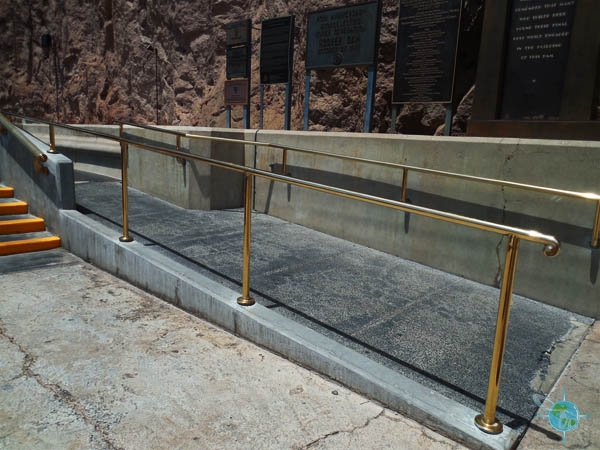 A paved pathway leads from the ground parking level to the Hoover Dam promenade. A sign directs people unable to use the escalator to the elevator to the Visitor Center. Here is the starting point for the “Powerplant Tour,” the only wheelchair friendly tour, which lasts about a half hour and requires an admission fee. This tour begins with a movie screening. Five open spaces with companion seats are on the bottom level of the theater; sub-titles are incorporated into the movie.