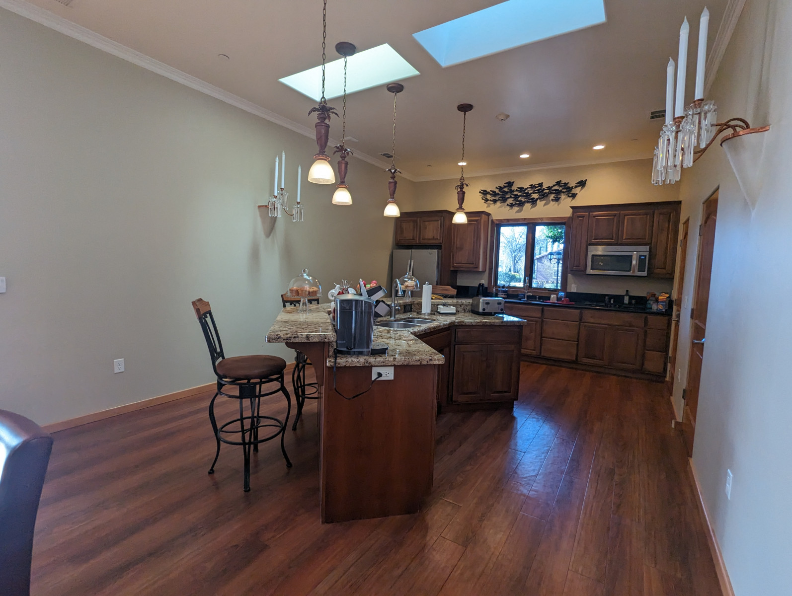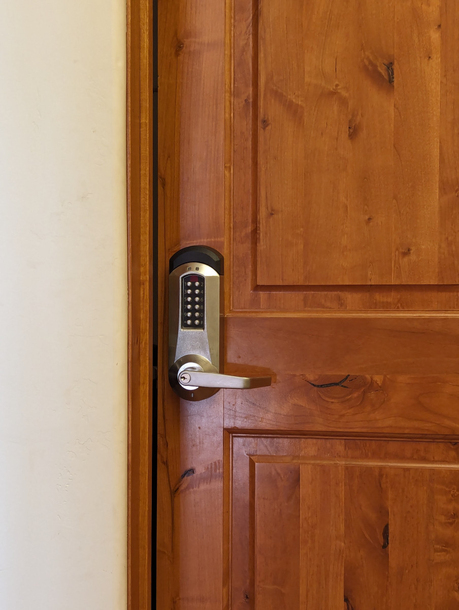 One designated handicapped parking space is located in front and the ramp is to the left of the front door. Upon arrival, guests use a push-button code entry for both the main and room doors, eliminating the need for assistance from hotel staff. This feature ensures autonomy and seamless access for all guests. The main room is the kitchen. While the kitchen offers continental breakfast items, it’s worth noting that specific wheelchair accommodations are not provided in this area, like a lowered table.