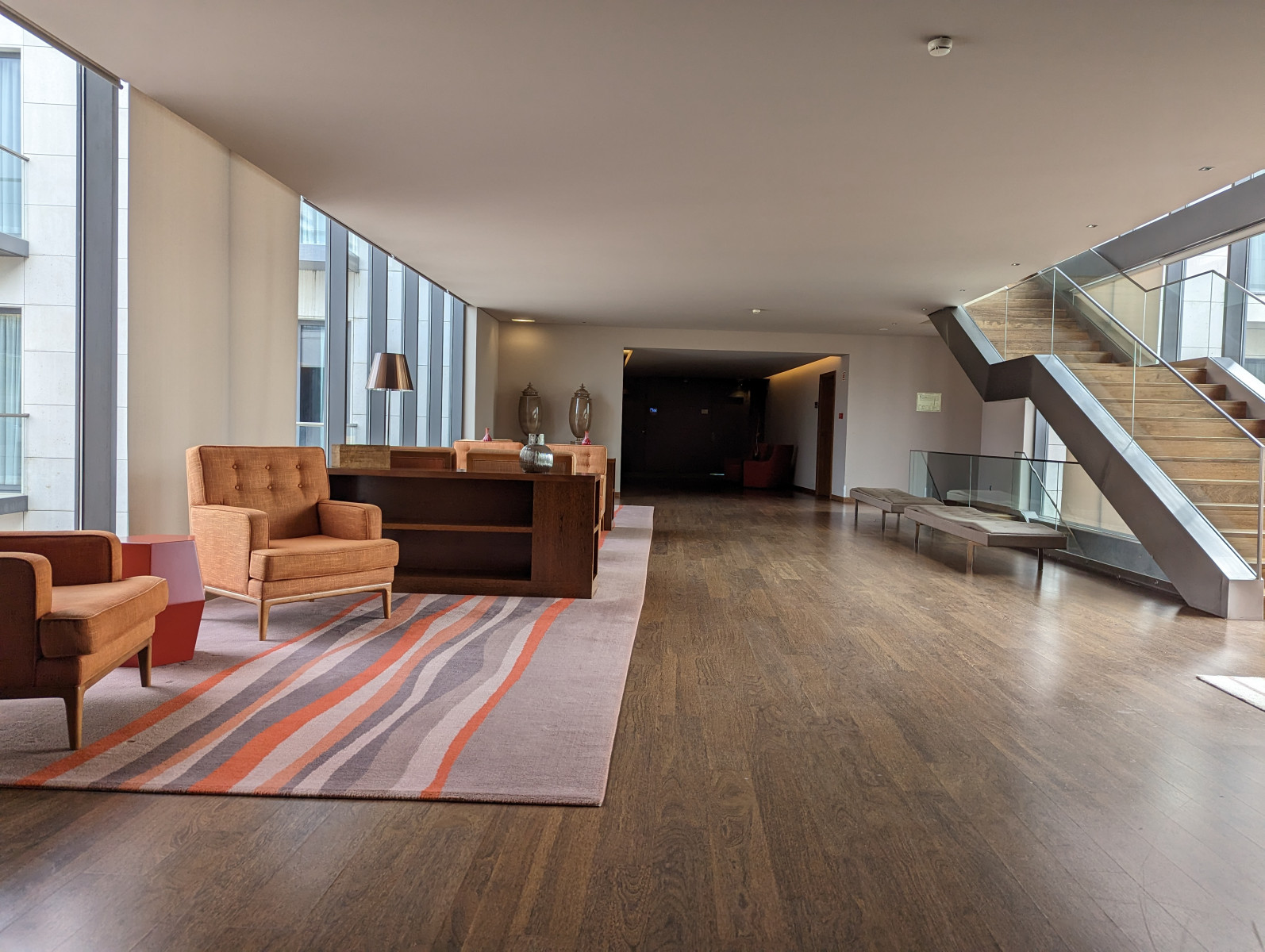The ground floor has wood floors with rugs off to the side at sitting area, and the hallways to the rooms are carpeted. A patio is available in the back of the hotel, but barrier-free access to it from inside the hotel is missing; going outside and around the hotel may be possible for some but inconvenient.