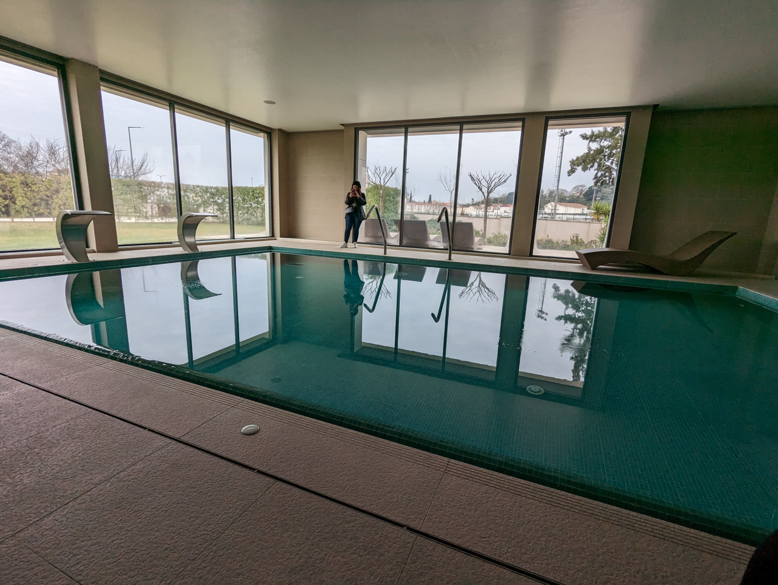 Hotel Villa has an indoor pool and spa with very few accessible features. Neither the hot tub nor the pool has a wheelchair accessible lift. The bathroom and barrier-free shower are in a wide area but do not have accessible features like grab-bars.