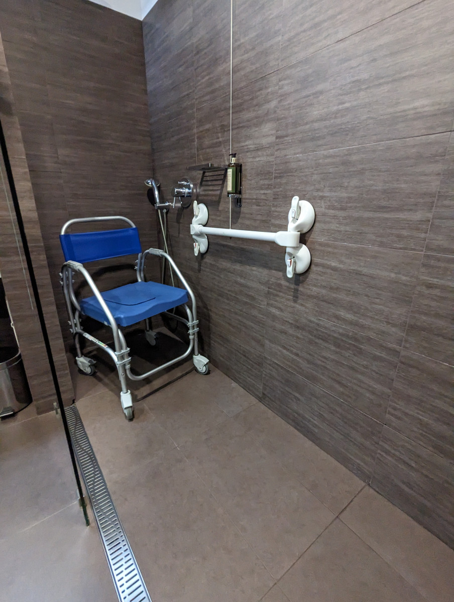 The shower nozzle is mounted lower and within reach while sitting down. No grab-bars are placed in the shower automatically, but the hotel provides portable ones. The hotel can also provide a shower bench; likely one with handles and one without as seen in the photos; contact the hotel to arrange or make plans to rent or bring one.