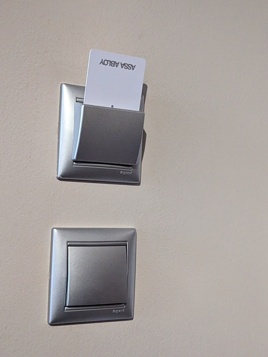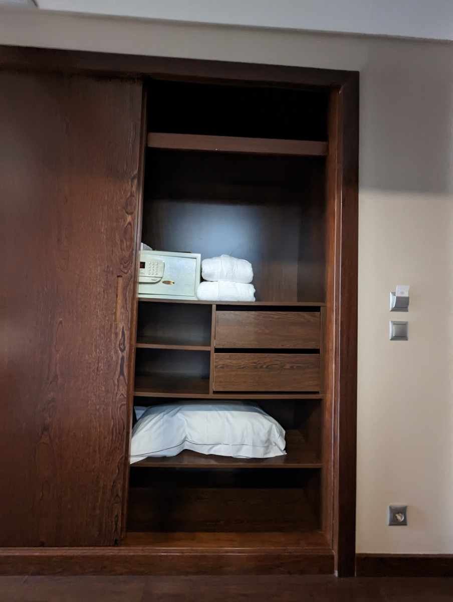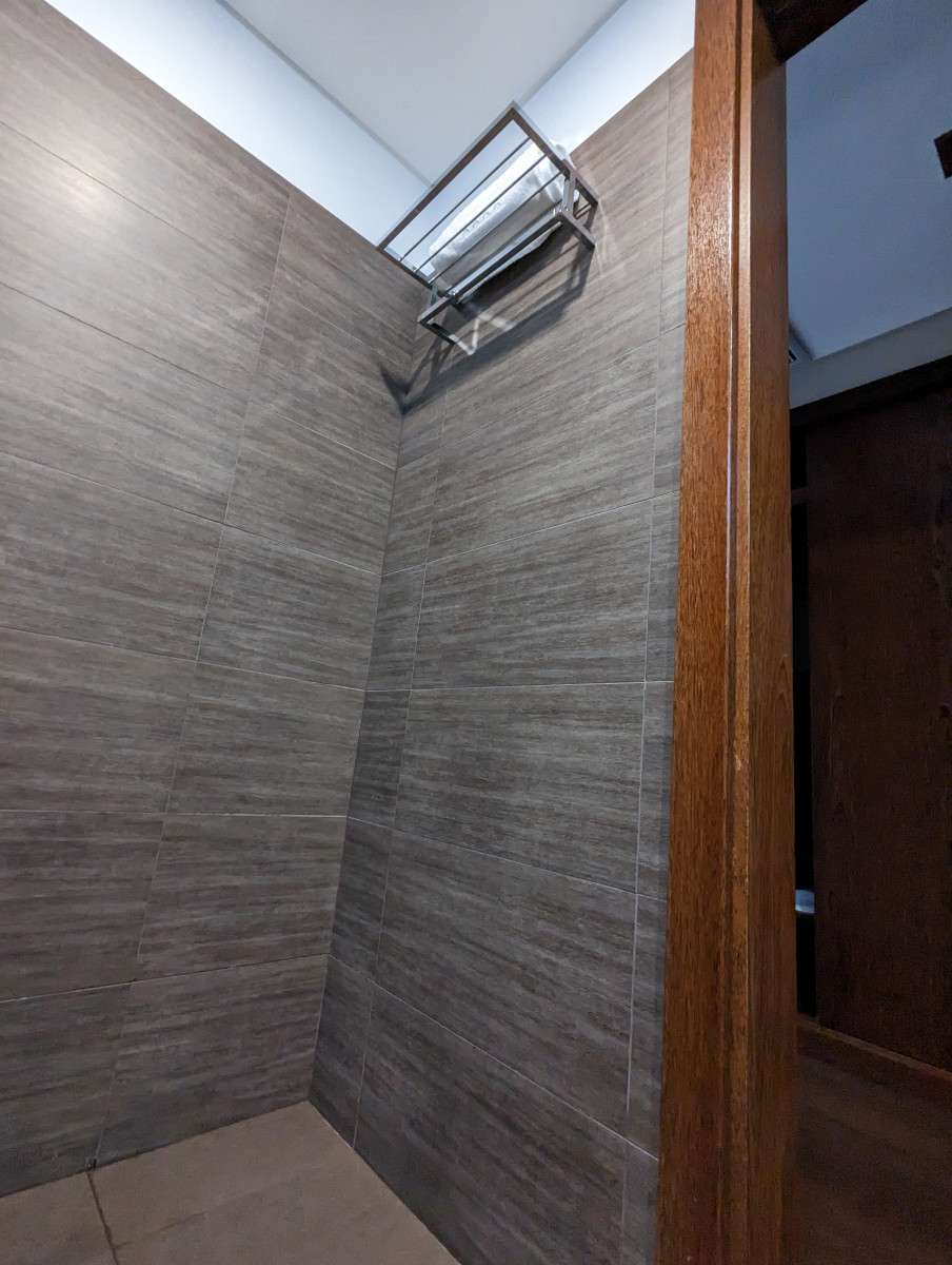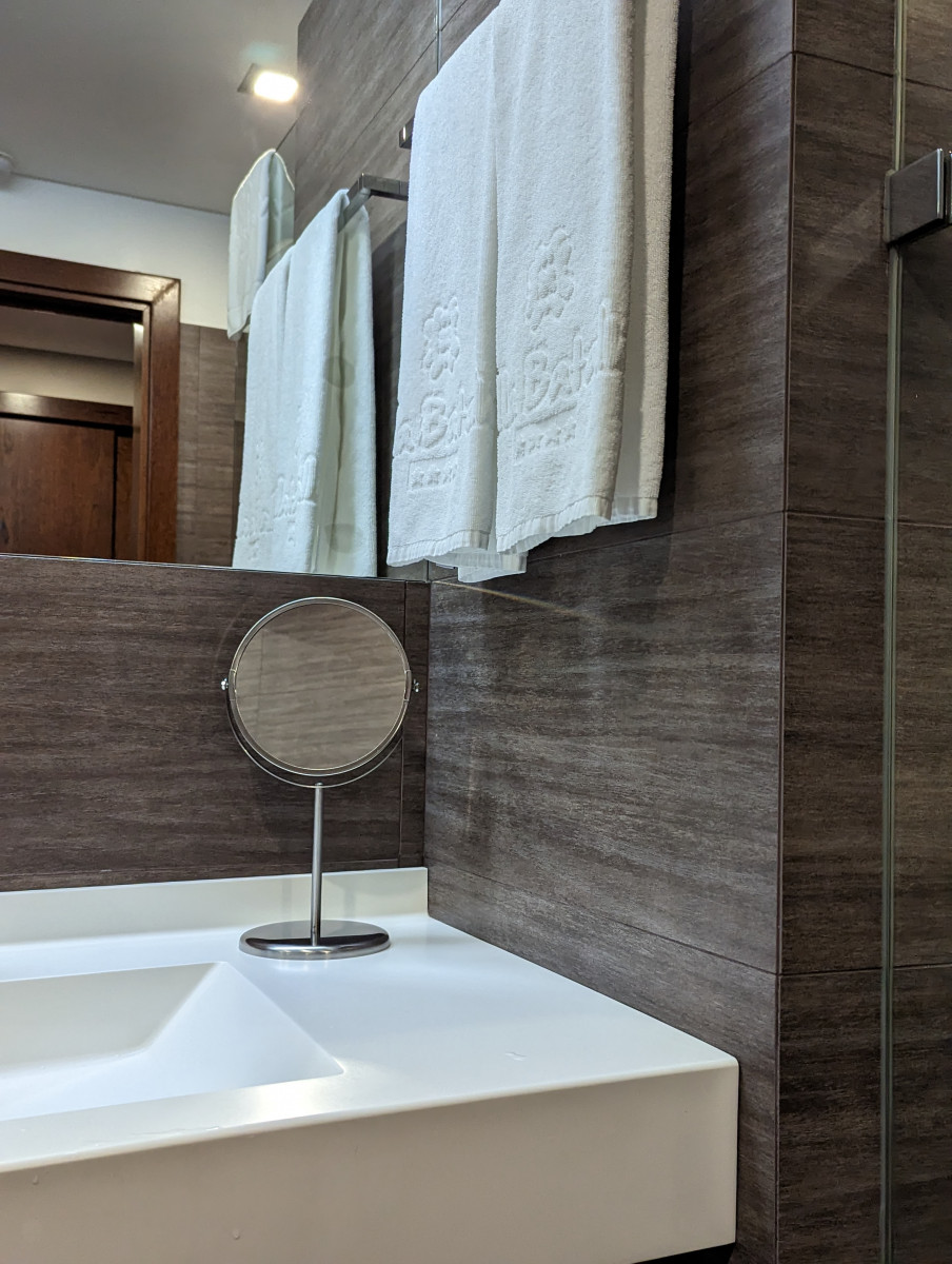 A shelf for towels is placed high in the corner of the shower, so if you cannot stand, reaching it is problematic. The mounted makeup mirror is also too high to access from a wheelchair, but a portable mirror may be provided upon request.