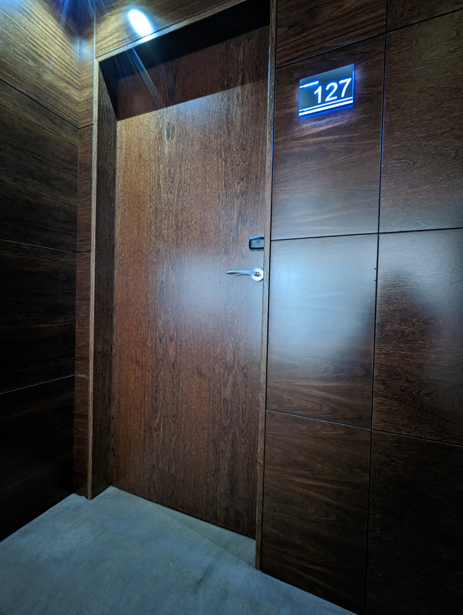Every room has a universal design to be more accessible to all and doors open with a key card. The key card must be inserted for electricity to work. Each room includes a toilet with drop-down grab-bars, a roll-up sink, and a barrier-free shower with a hand-held shower nozzle.