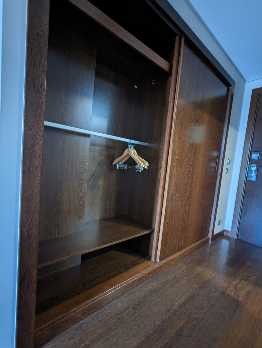 Rooms have two firm twin beds pushed together. The placement of the refrigerator was not possible to open and access by wheelchair. The closest had lower drawers and a bar to hang clothes up.