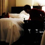 On one floor, guests may access a very large, “family-style” accessible bathroom. This particular bathroom is not attached to any specific room and requires a key to access it. It is the most accessible bathroom in the hotel with grab-bars around the toilet and in the roll-in shower, which has a portable shower chair and hand-held shower nozzle.