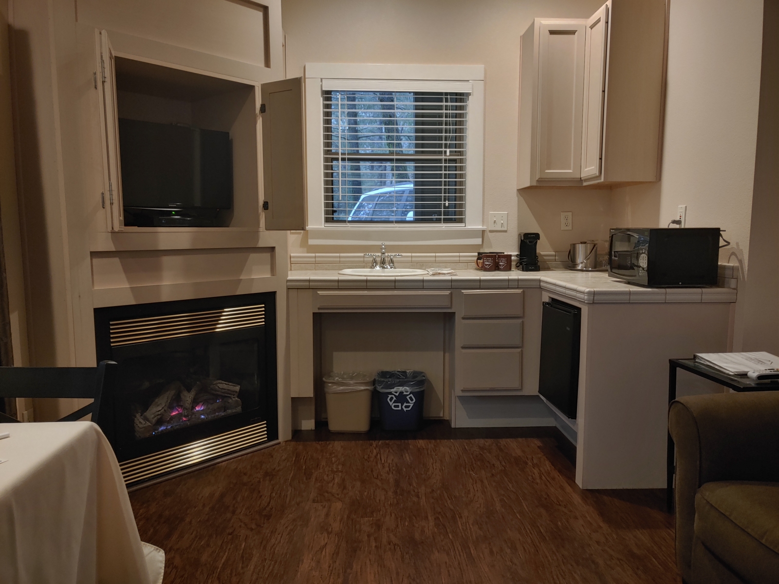 Upon entry, a small living area is seen with couch facing a television and fireplace in the corner. The fireplace turns on with a switch on the wall and really keeps the place warm. A small table is near kitchen sink, which is roll-up, and includes storage space as well as a mini refrigerator (no freezer) and microwave. Utensils or flatware are not provided in the room but are given with breakfast and collected afterwards.