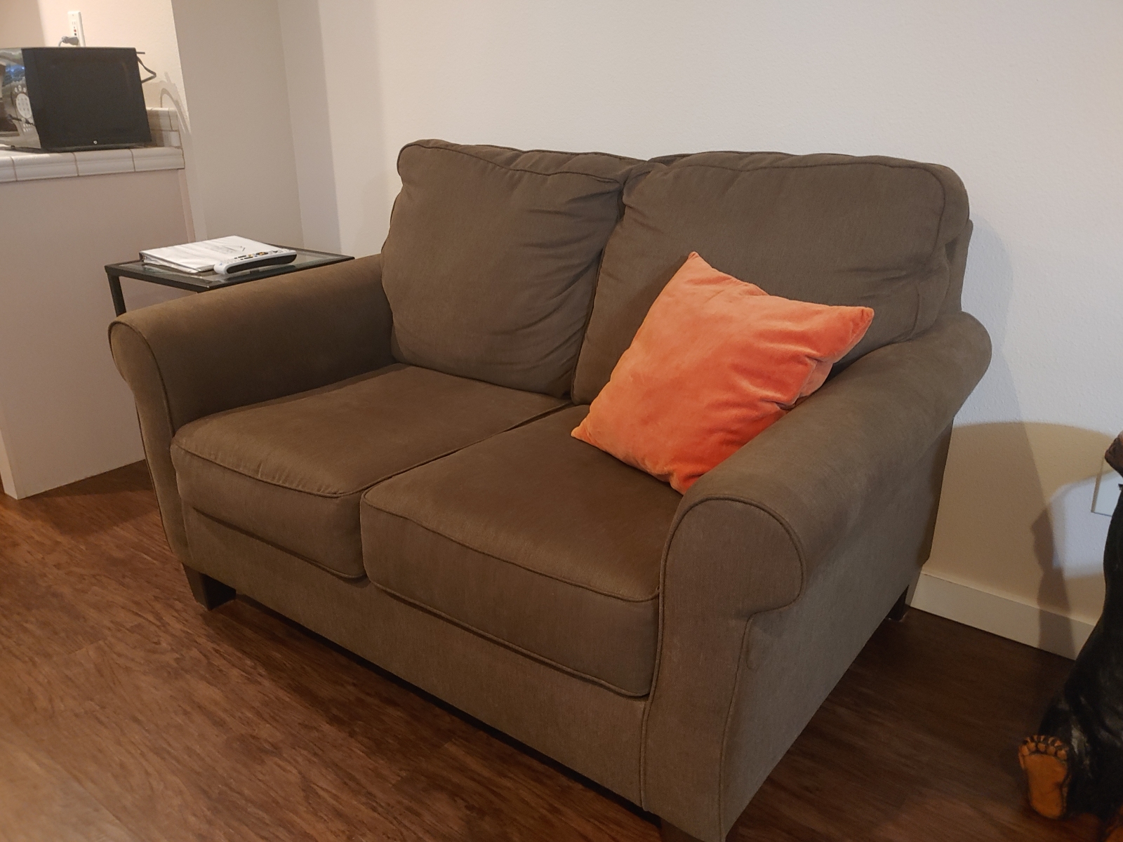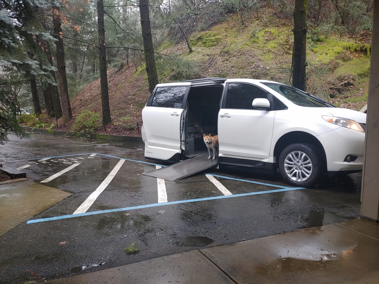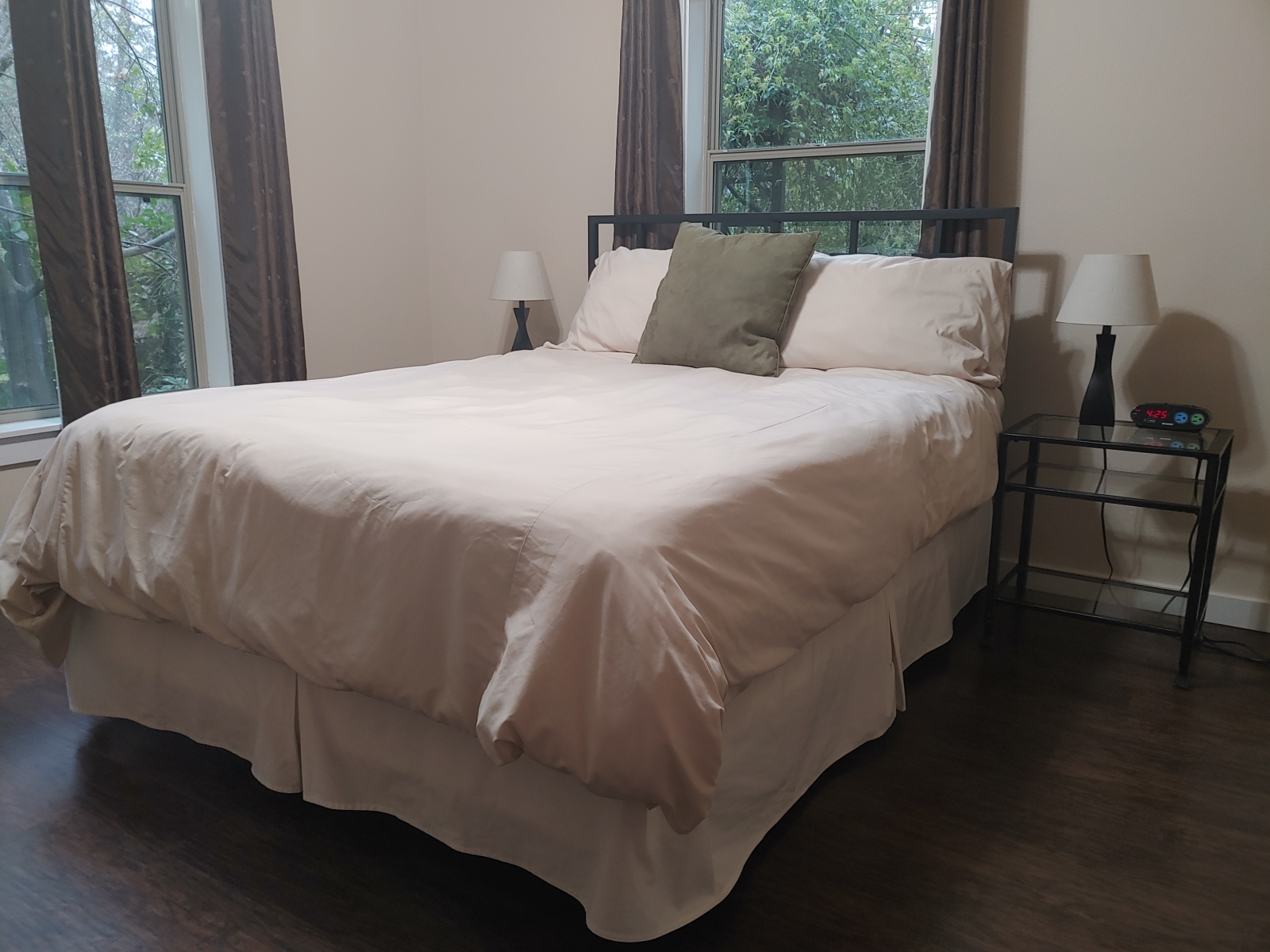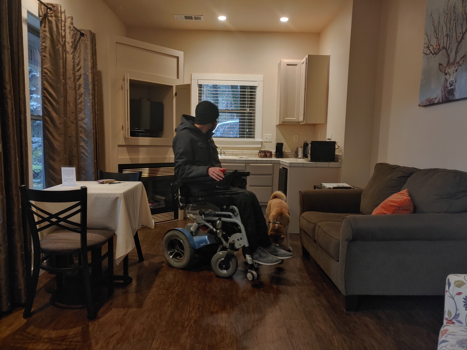 The bedroom has a full-sized bed and an open aisle on each side of the bed. Power outlets are available in the bedroom as well as the living room area. The bathroom has been modified with grab-bars around the toilet and shower. A roll-under sink is next to the roll-in shower with hand-held shower nozzle. No official shower bench was provided, so I suggested getting plastic patio chair with arms at the very least, which is now available to future guests.
