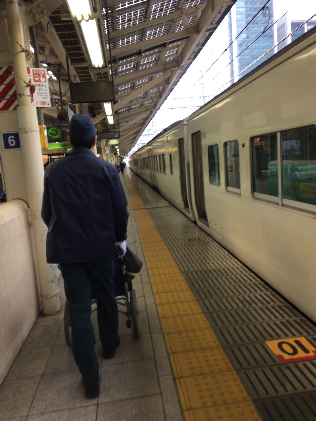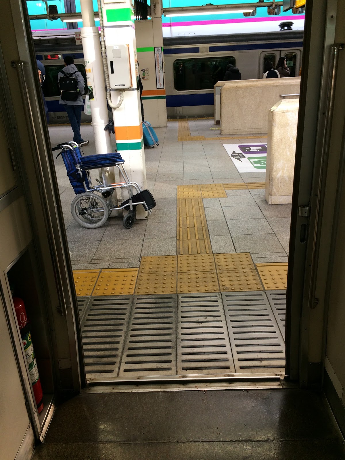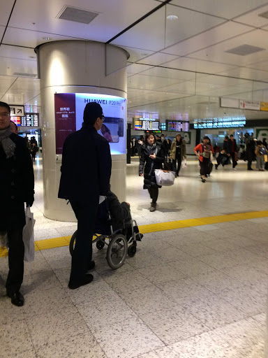 With regard to access to trains when in a wheelchair, I had a personal experience with my grandmother this year. We transferred from the local train – bullet train – the local train to get to our destination starting in JR East and then ending in JR West area. Throughout this time at each station, an attendant was ready to meet us at the gate and escorted us to the train. They always called ahead, so an attendant with the slope to fill the gap from the train to the platform was always waiting upon arrival. They used their radios to communicate with the driver of each train so they knew which car and when the assistance was being provided and completed.