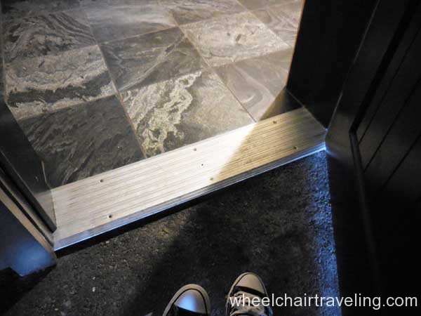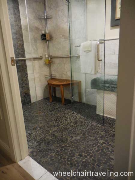 I was delighted to find wood floors on this entire level, which also included the fitness room, spa, and restaurant. Here you will also find an accessible drinking fountain; though bottled and flavor water are also available for no additional fee. Bottles of water in rooms are complimentary and by the check-in desks feel free to fill up your water bottle with the flavored water of the day; refreshing!