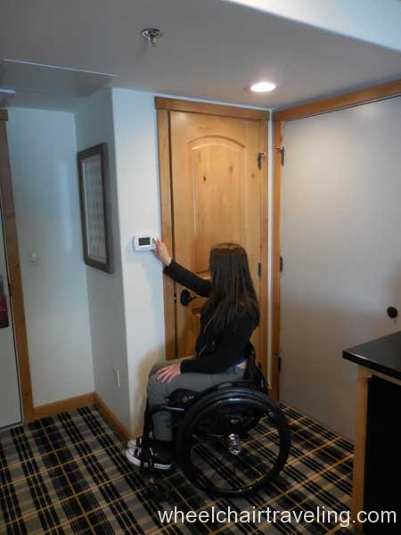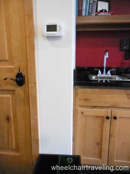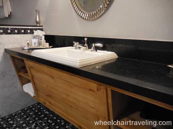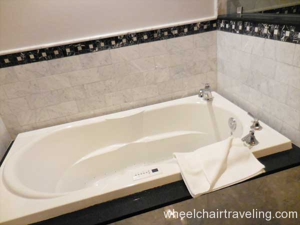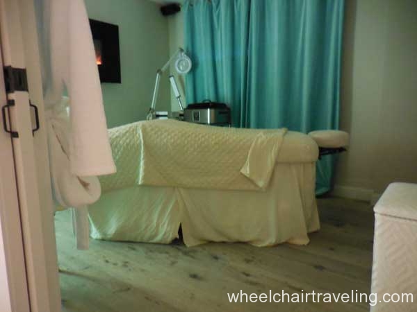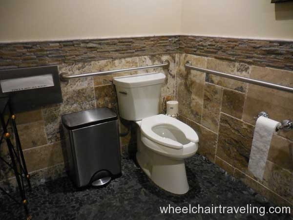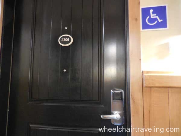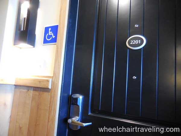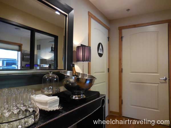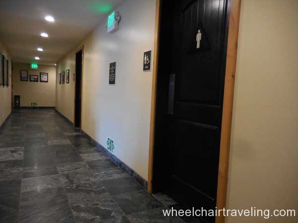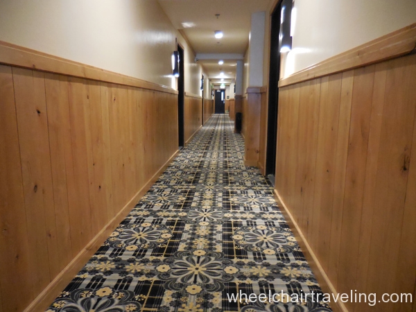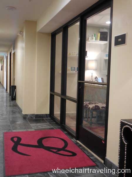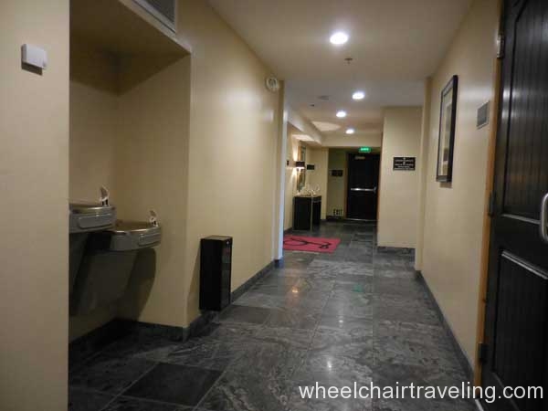 I was delighted to find wood floors on this entire level, which also included the fitness room, spa, and restaurant. Here you will also find an accessible drinking fountain; though bottled and flavor water are also available for no additional fee. Bottles of water in rooms are complimentary and by the check-in desks feel free to fill up your water bottle with the flavored water of the day; refreshing!