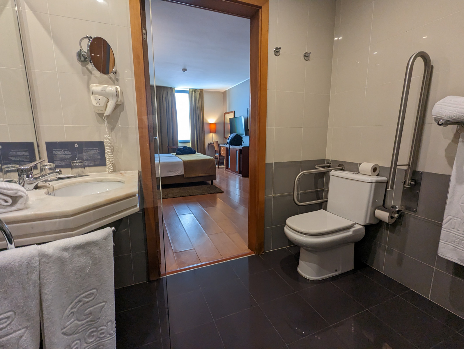 Several rooms have been modified to be wheelchair accessible for guests traveling to Portugal. Nonetheless, though possible, there were still some obvious challenges to staying at Hotel Vila Galé Ópera in Lisbon. The main barrier for most may be the shower setup. Although the shower is step-free and with a hand-held nozzle, the glass door may be challenging to maneuver a wheelchair around when getting in and out. Plus, there are no grab-bars or a shower chair. *