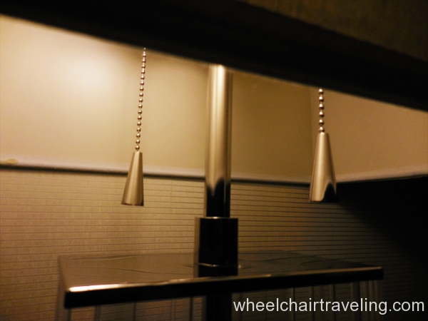 Overall the most challenging aspect (for some) is the shower itself. Instead of a curtain there is a glass door. The shower, however, is not that big so one must be able to transfer to the portable chair and push the chair out of the showering area or have someone remove it. The shower space is on the smaller side with heart/cold control valves in front of you and the shelf on the back right.