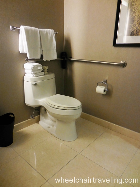 Despite the ramp to the right of the main door, there is no accessible path to the entrance; one must travel over speed bump first. Not only is this design inaccessible it is also unsafe. A section of the check-in desk is accessible and not too far away are the elevators to take you to your floors.