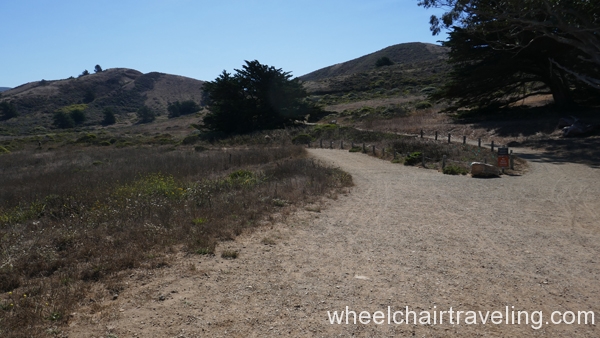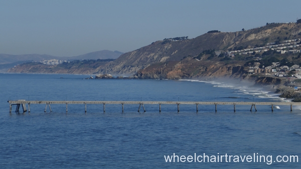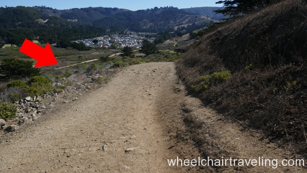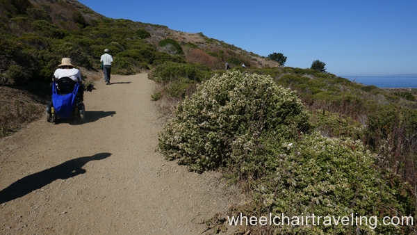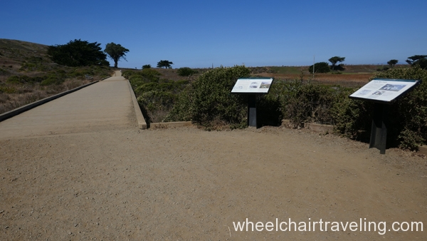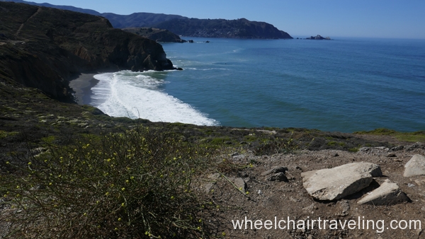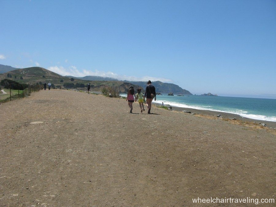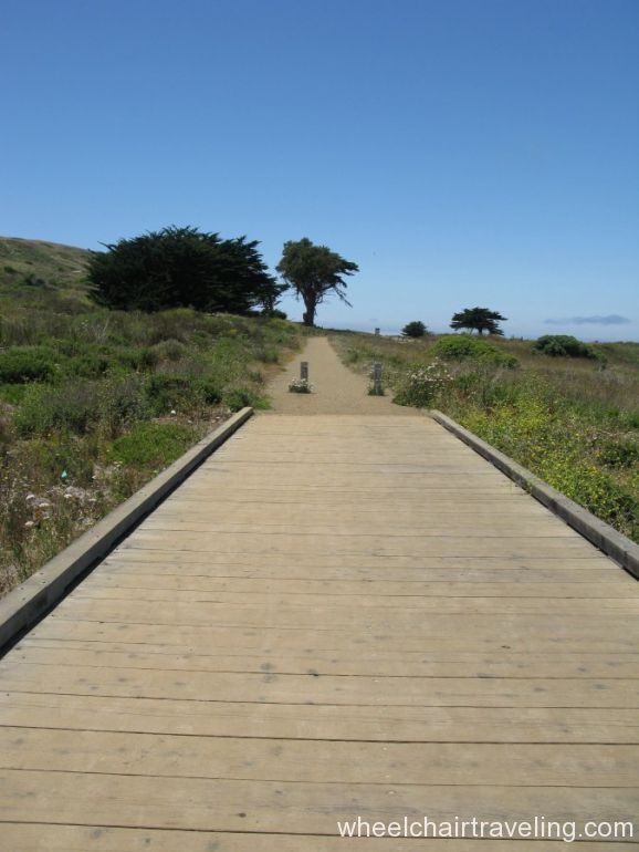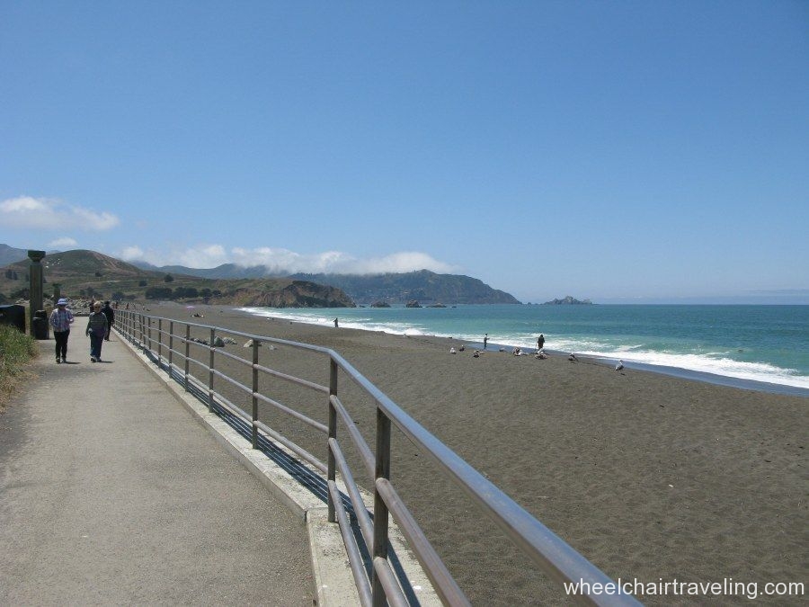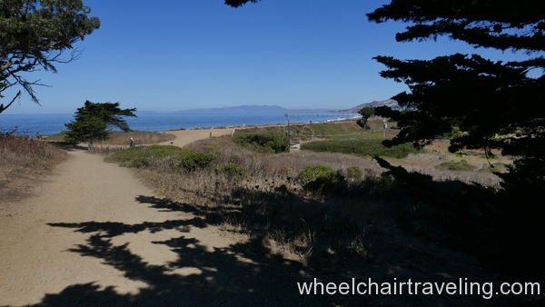 From the pier, head south on the paved promenade that travels along Beach Boulevard for a few blocks, to Clarendon Road. From there, if you can manage a short but steep and sometimes sandy slope, you can access a hard-packed dirt and rock levee trail and continue south for another .5 miles to the end of the beach at Mori Point. The promenade can be a difficult ride because of windblown sand, standing rainwater, and bird droppings. The levee trail runs between the beach and Sharp Park Golf Course. From this elevated vantage point you may spot pelicans skimming the ocean’s surface, shorebirds probing the sand, and occasionally sea lions and whales swimming close to shore. You’re almost certain to meet dogs and energetic walkers on this trail.