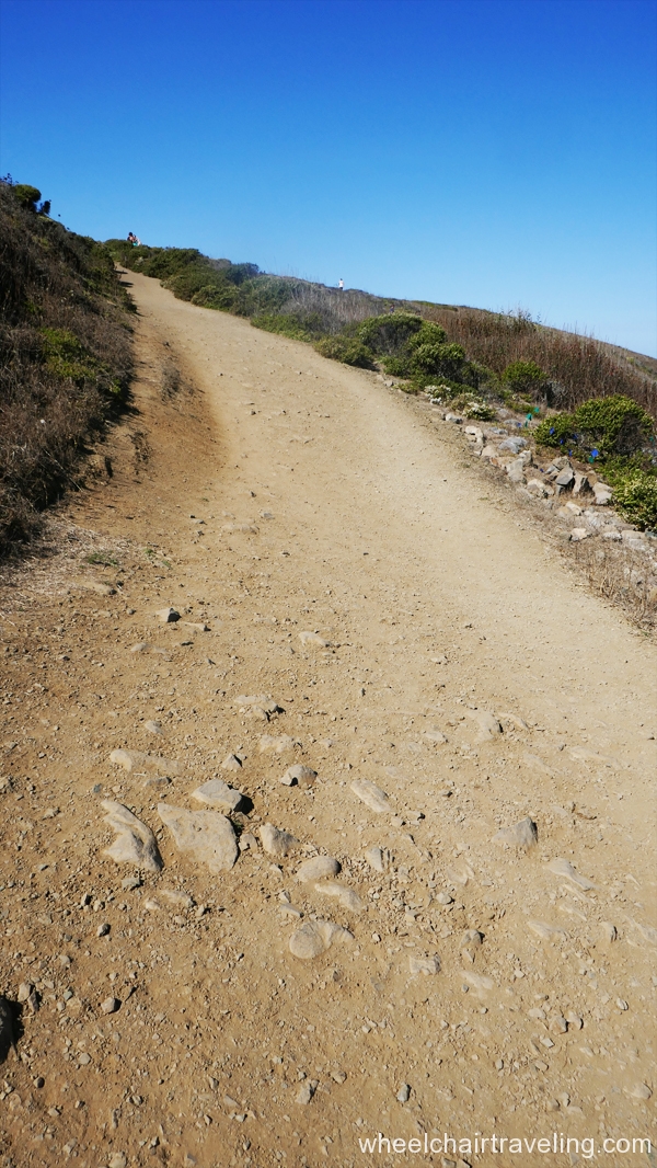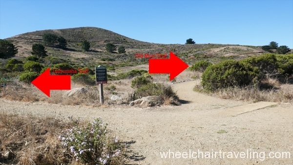As you approach the point you will see the Bootlegger Steps Trail heading straight up the bluff. Before you reach them, the berm trail branches and rhe Lishumsha Trail continues to the right, toward the hills, while the left-hand trail (Old Mori Road) curves inland towards a parking lot. If you’re really adventurous, consider making a side trip along the stretch of Coastal Trail that takes off immediately past the trail to Bootlegger Steps, also on the right, and turns into the Mori Headlands Trail. The Mori Headlands Trail climbs steeply for a few hundred yards to the blufftop known as Mori Point, where the ocean views are spectacular. In spring, the Mori Point bluff is often awash in wildflowers. The last twenty feet or so to the top of Mori Point is the steepest section, so choose routes carefully and go slow; use assistance if needed. This