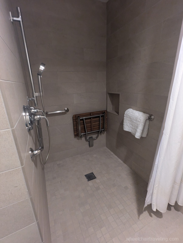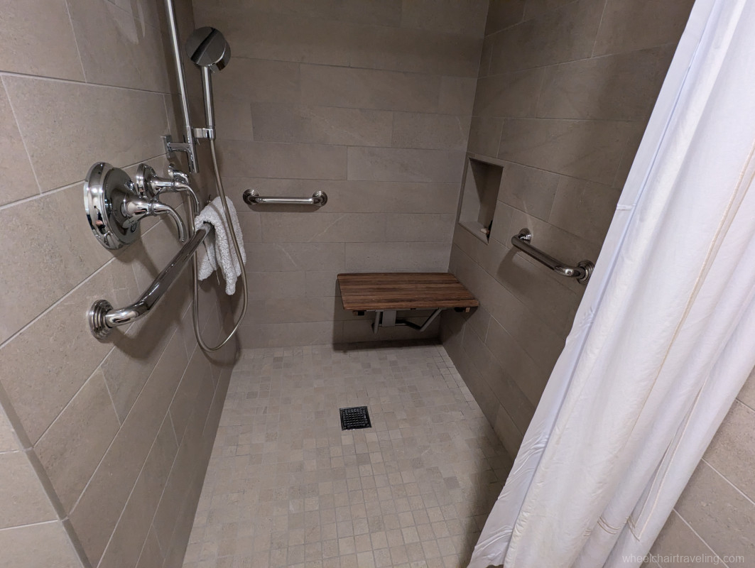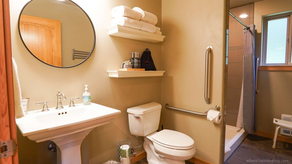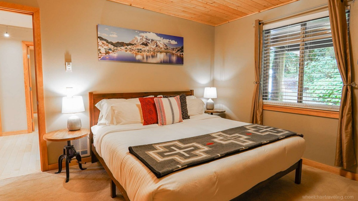 - Accessible Bedrooms and Bathroom: Two king bedrooms on the main floor are designed with accessibility in mind. The main floor bathroom is equipped with grab bars, a low-threshold shower with a 2-inch lip or step, a mounted shower bench, and hand-held shower nozzle.