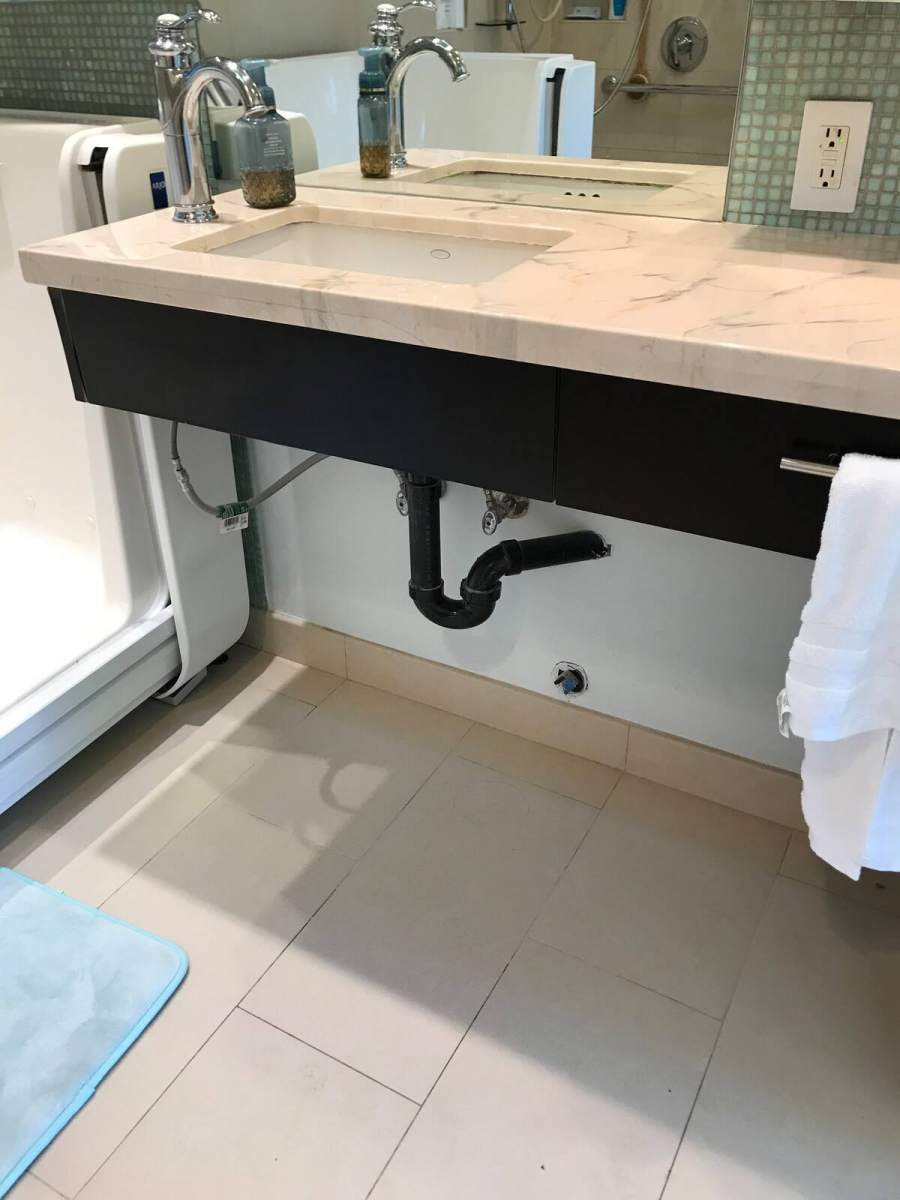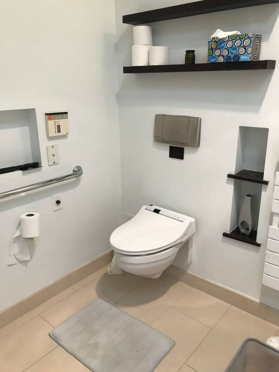 The area surrounding the toilet has at least one grab bar that’s bolted or otherwise firmly attached to the wall. On the wall near the toilet is the control panel for the bidet seat, and includes a heated seat, warm water for rear and front rinsing, and a dryer too. The sink is a roll-up. The shower has at least one grab bar that’s bolted or otherwise firmly attached to the shower wall. Next to the roll-in shower is towel warmer.