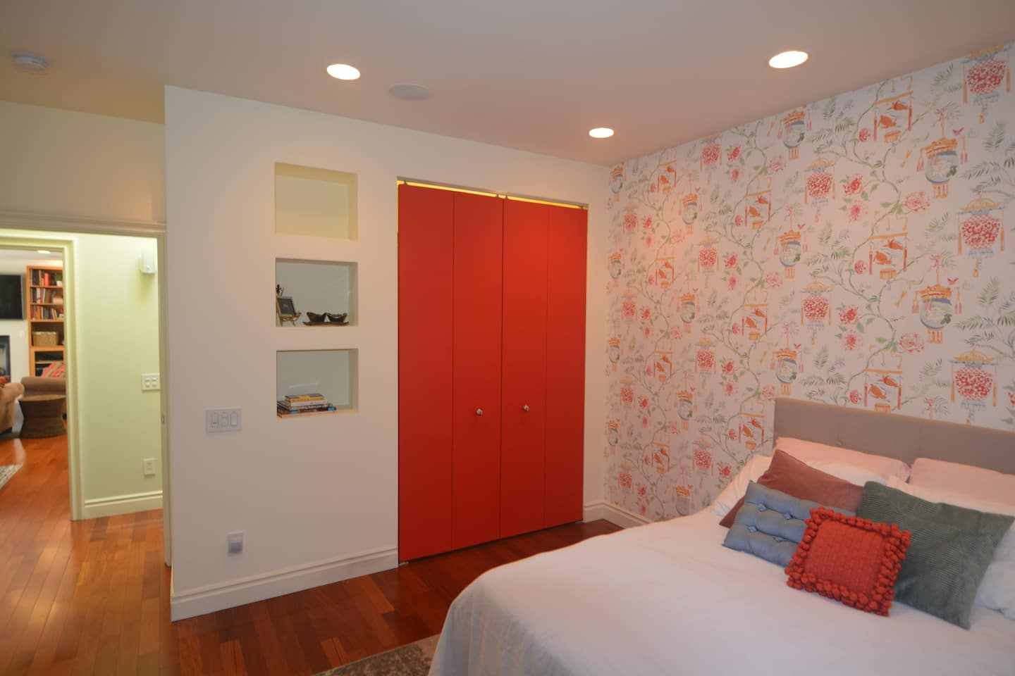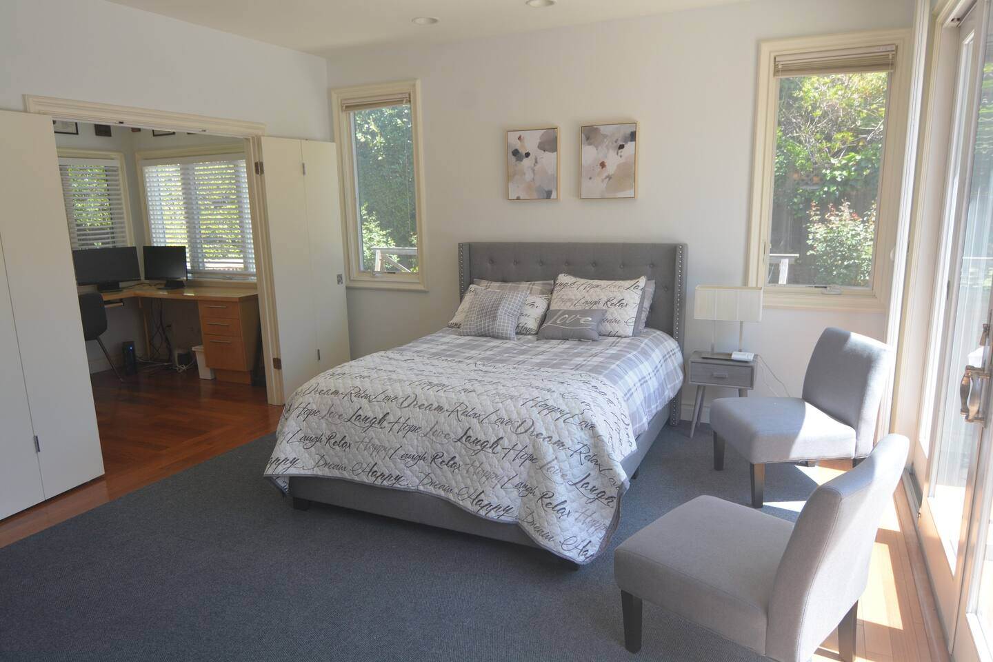 All bedrooms and great room are Ethernet hard wired (cables provided), so no dropped WiFi signals. Air purifiers in each bedroom. The first bedroom has 1 queen bed and 1 single bed. Another room has 1 queen bed, and the last room has 1 double bed. The final bed in the house is a hospital stye bed; an extra pull-down Murphy bed is nearby in the study.